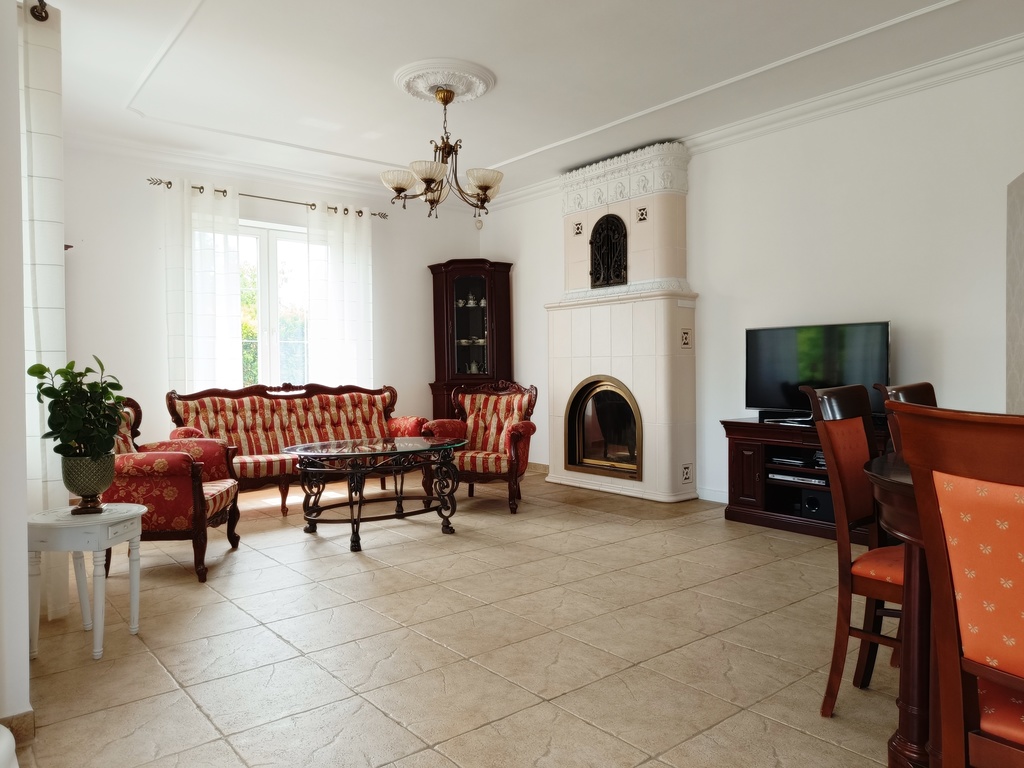 - przestronny salon z kominkiem dodatkowo połączony z wykuszem - z wyjściem na zadaszony taras