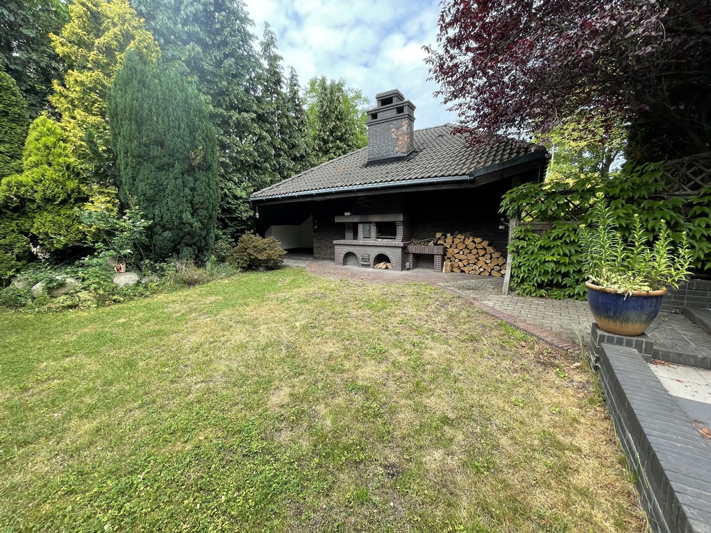 Duży ogród z licznymi nasadzeniami, wolnostojący budynek garażowy z dwoma stanowiskami oraz pomieszczeniem gospodarczym i grillem od strony ogrodu.