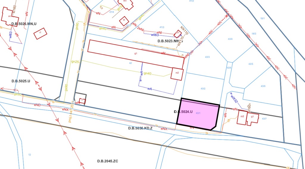 Działka, według planu zagospodarowania, oznaczona jako teren elementarny D.B.5024.U. Przy działce skrzynka ZK oraz linia telefoniczna, gaz w odległości około 120 metrów. Przyłącze wody miejskiej w znacznej odległości, natomiast do końca roku powinny zostać zakończone prace związane z opracowaniem modyfikacji planu zagospodarowania przestrzennego przewidujące również montaż własnego ujęcia wody ze studni głębinowej.