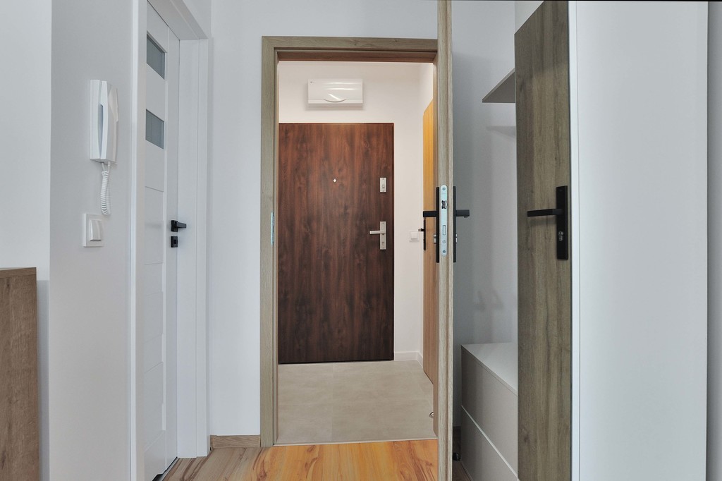 OPIS MIESZKANIA: Do wynajęcia mieszkanie znajdujące się na ostatnim piętrze IV-piętrowego budynku. Jego całkowita powierzchnia wynosi 23 m2, jest w pełni umeblowane i wyposażone. W mieszkaniu znajduje się przedpokój, salon z aneksem kuchennym (z którego jest wyjście na spory balkon), łazienka z WC. Wejście do mieszkania przez przedpokój z szafą i wieszakiem na odzież wierzchnią. Łazienka wyposażona jest w kabinę prysznicową, WC, umywalkę ze znajdującą się pod nią szafką, pralkę, lustro, wiszącą szafkę na kosmetyki. Kuchnia jest umeblowana i wyposażona w sprzęt AGD: lodówko-zamrażarkę, płytę indukcyjną, piekarnik elektryczny, zmywarkę, pochłaniacz, czajnik elektryczny. Stąd jest też wyjście na spory balkon, gdzie do dyspozycji najemców są rattanowe meble ogrodowe: stół i dwa fotele. Salon wyposażony jest w rozkładaną sofę, stolik z dwoma krzesłami, stolik kawowy, a także regał.
