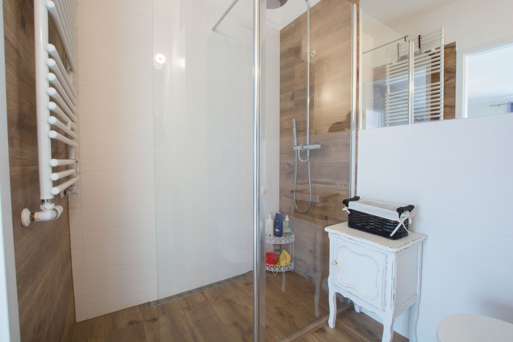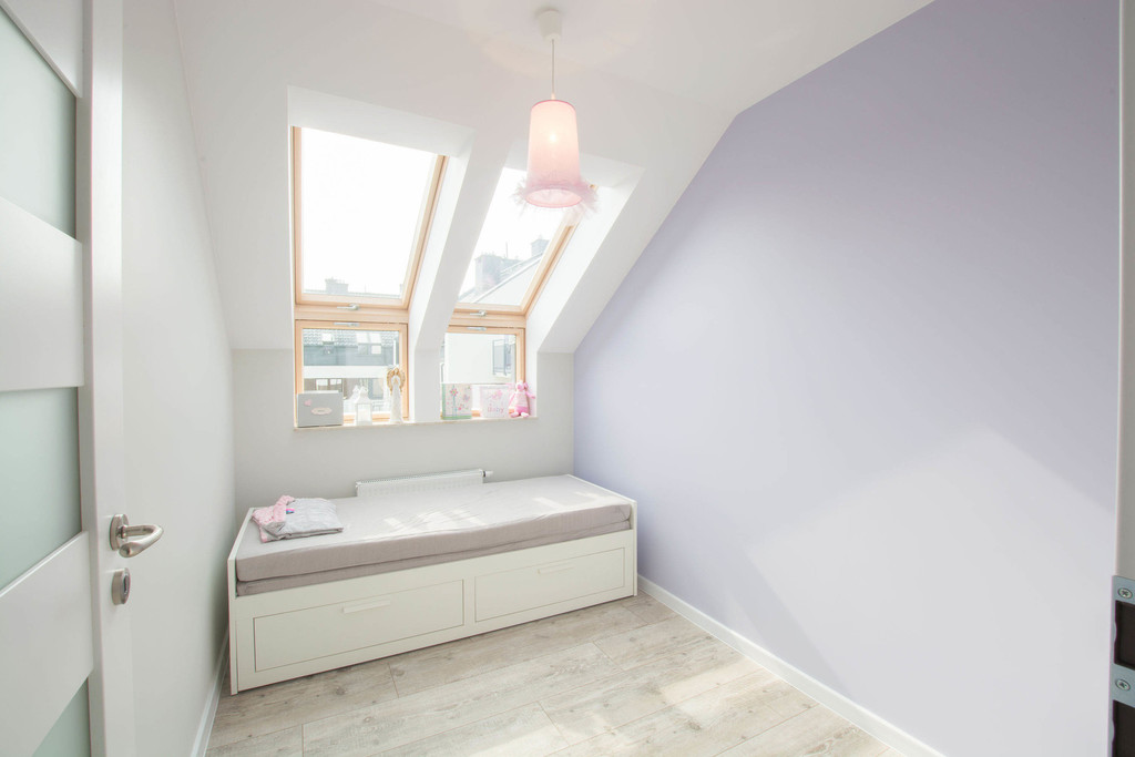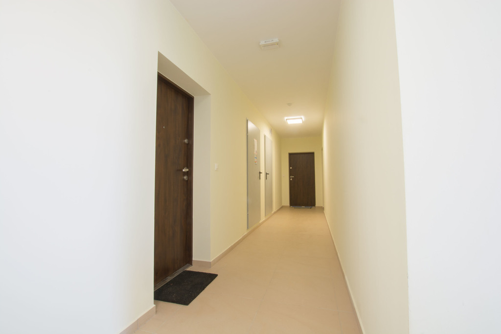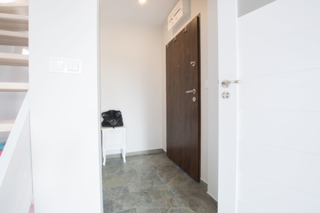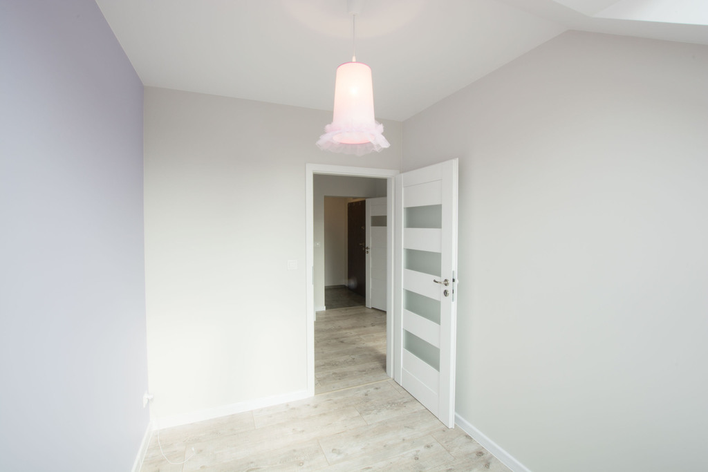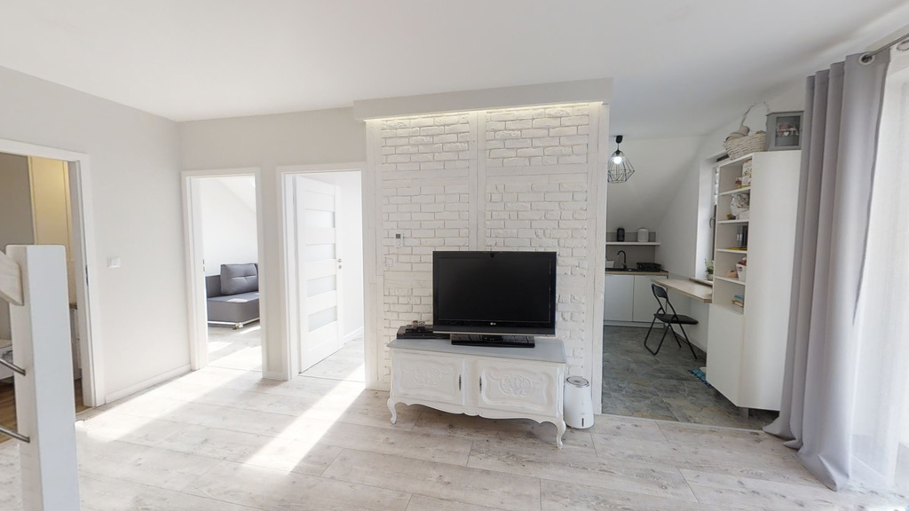W dolnej części mamy: korytarz, dwa osobne pokoje, salon z aneksem kuchennym i łazienkę z prysznicem. W górnej części: garderoba, łazienka, korytarz, zamknięty pokój.