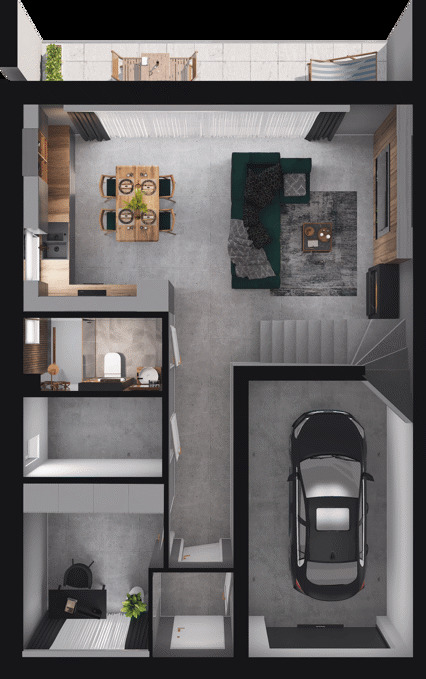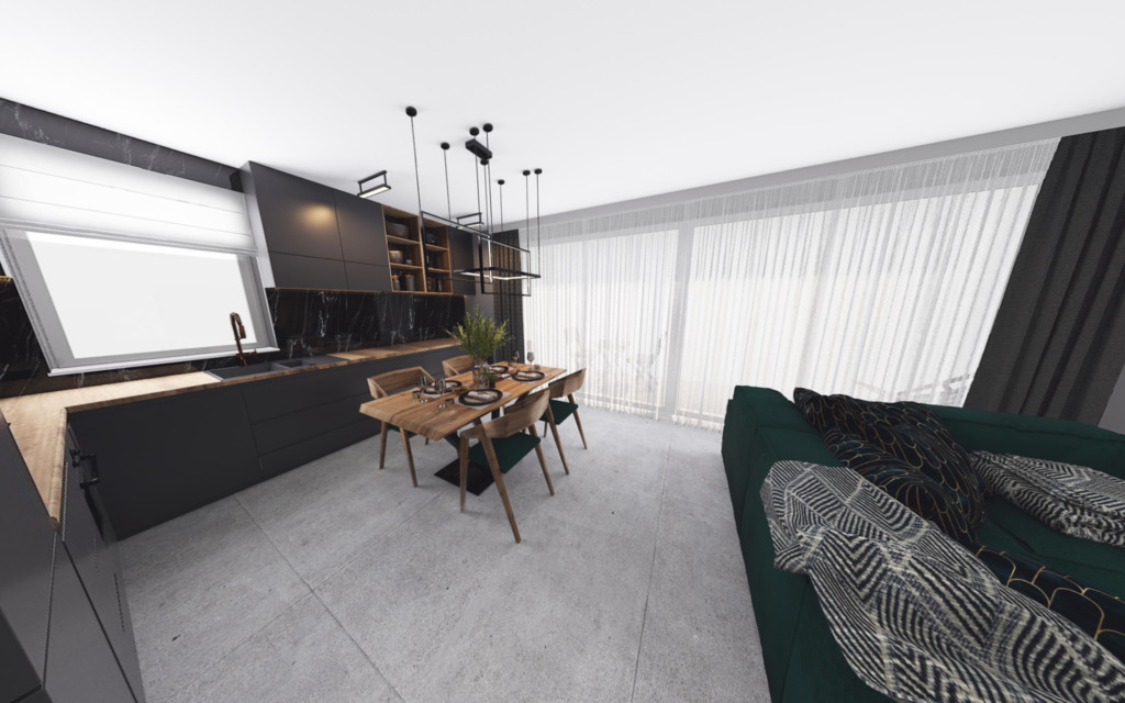 -przestronny salon z aneksem kuchennym o powierzchni 32,39 mkw, z którego przez przestronne okno o szerokości 5 metrów jest wyjście na ogród