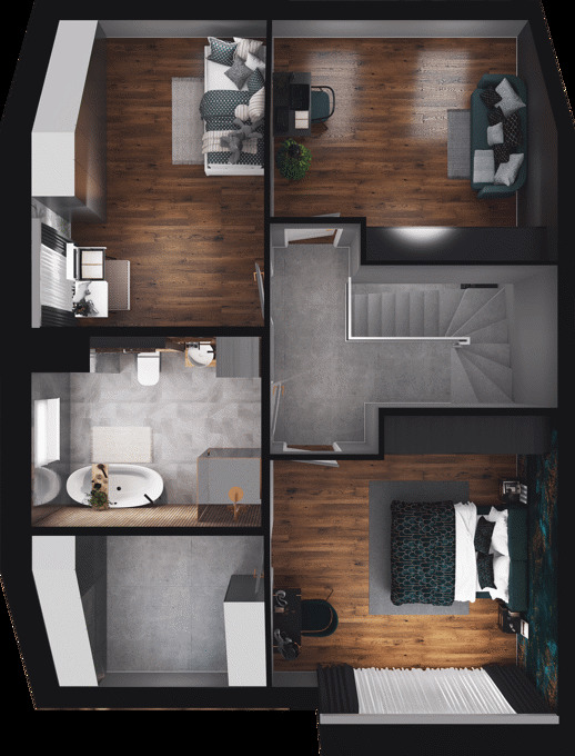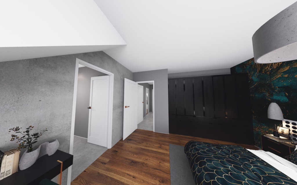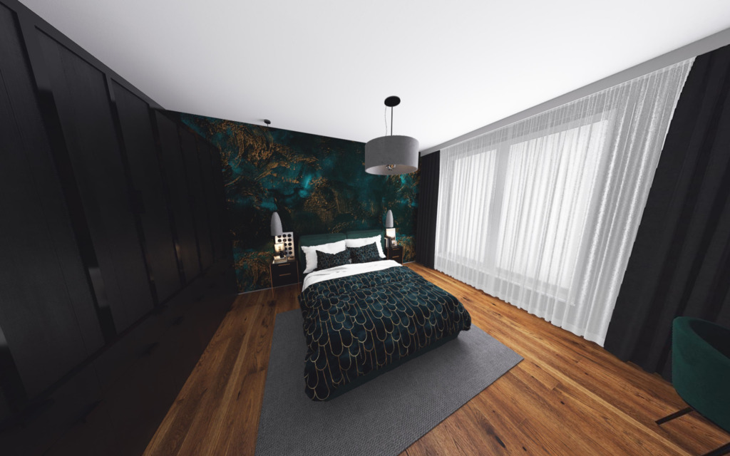 -sypialnia główna o powierzchni 15,58 mkw, z której mamy bezpośredni dostęp do garderoby o powierzchni 6,17 mkw.