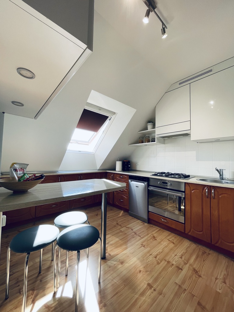 W kuchni zostało zamontowane okno dachowe premium firmy Velux z górnym otwieraniem. Zastosowano w nim konstrukcję Thermo Technology. Posiada ono innowacyjny system wentylacyjny i pozwala na uniesienie okna do kąta 45 stopni, zapewnia to doskonały widok na zewnątrz również stojąc.
