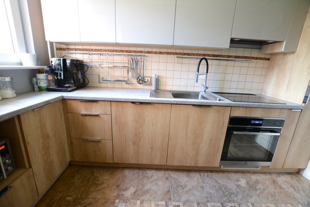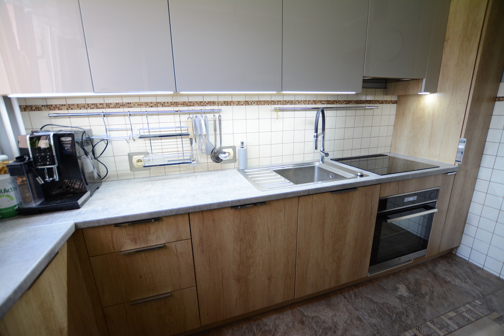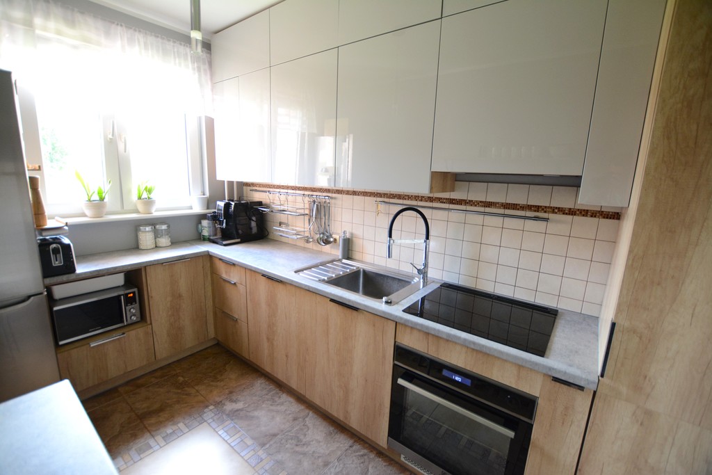 - meble kuchenne na wymiar, fronty akrylowe, mechanizmy firmy blum. Na wyposażeniu sprzęty AGD ( zmywarka, piekarnik z funkcją pary, płyta grzewcza gaz pod szkłem firmy Solagaz, okap z funkcjami sterowania gestem, oraz lodówka z zamrażalnikiem ).