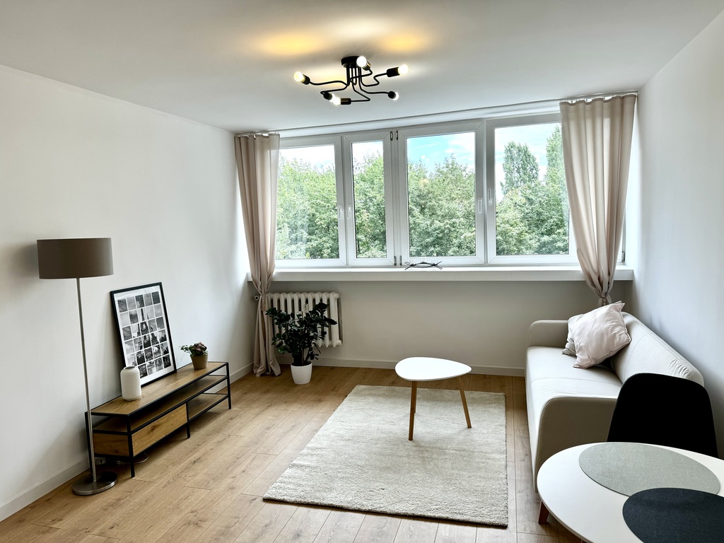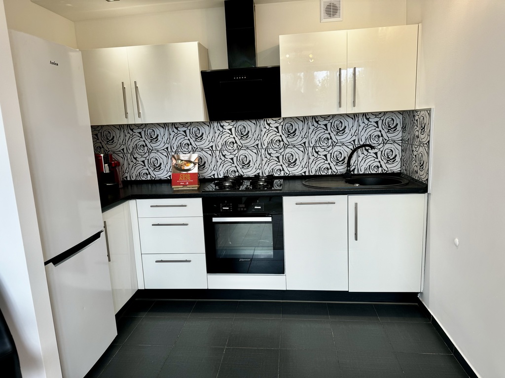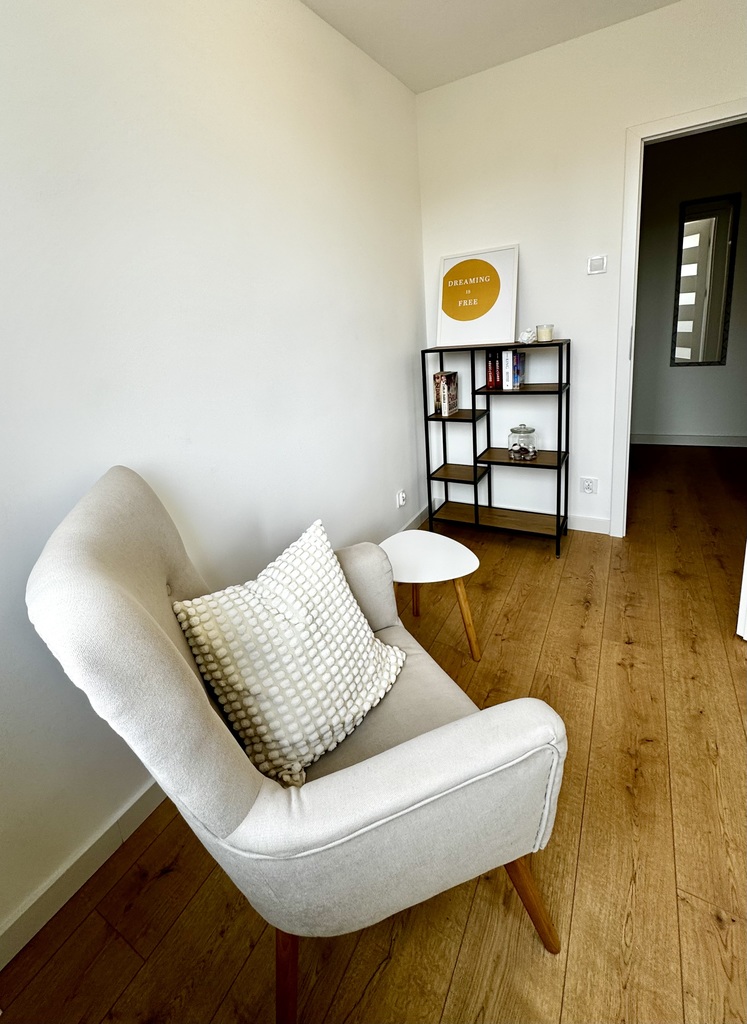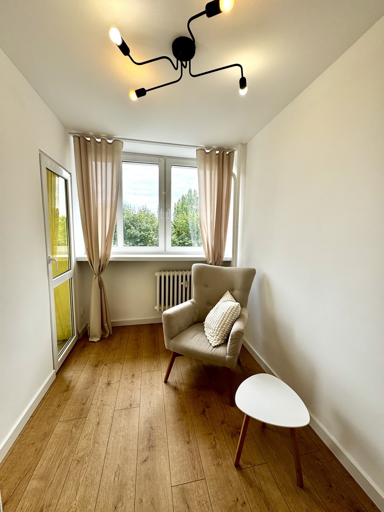 Większy pokój z aneksem kuchennym (wyposażenie obejmuje m.in. zmywarkę, piekarnik w zabudowie, nowoczesny okap, czy lodówkę), mniejszy z wyjściem na balkon. Okna (PCV) w mieszkaniu wychodzą na cichą stronę. Nowoczesna aranżacja sprawia, że w mieszkaniu poczujemy się komfortowo.
