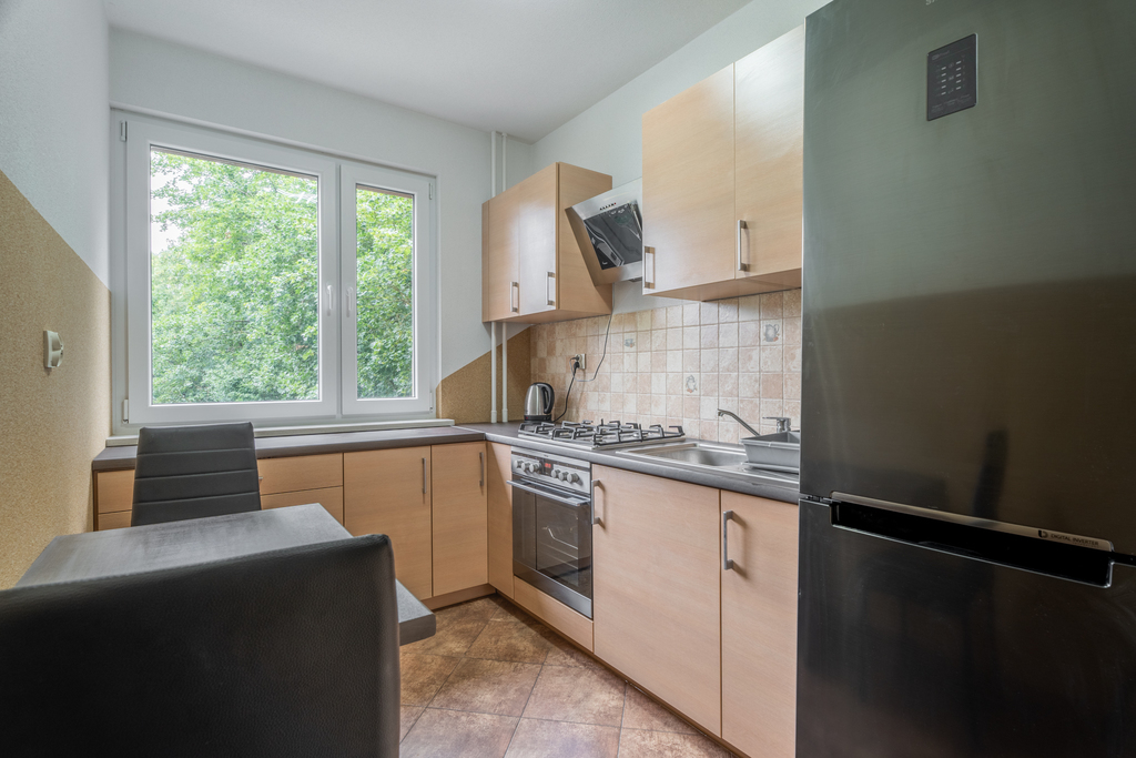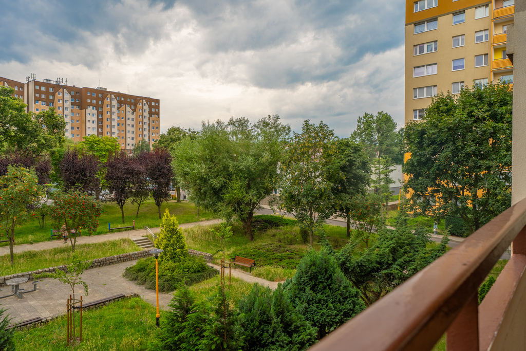 Lokal jest gotowy do zamieszkania, częściowo umeblowany i w pełni wyposażony. Liczne miejsca parkingowe ogólnodostępne na ulicy przed budynkiem. Dla bardziej wymagających kilkaset metrów od budynku znajduje się parking strzeżony. Nieruchomość zlokalizowana w budynku z nowymi windami na 2 piętrze (z 10). Spokojni sąsiedzi. Ogrzewanie miejskie. Wysokość pomieszczeń ok. 250 cm. Czysta, zadbana klatka schodowa jak i otoczenie całego budynku. Salon nasłoneczniony, skierowany na stronę południową z widokiem na zielone podwórko. Sypialnia i kuchnia skierowane na stronę północną z widokiem na zielony park.