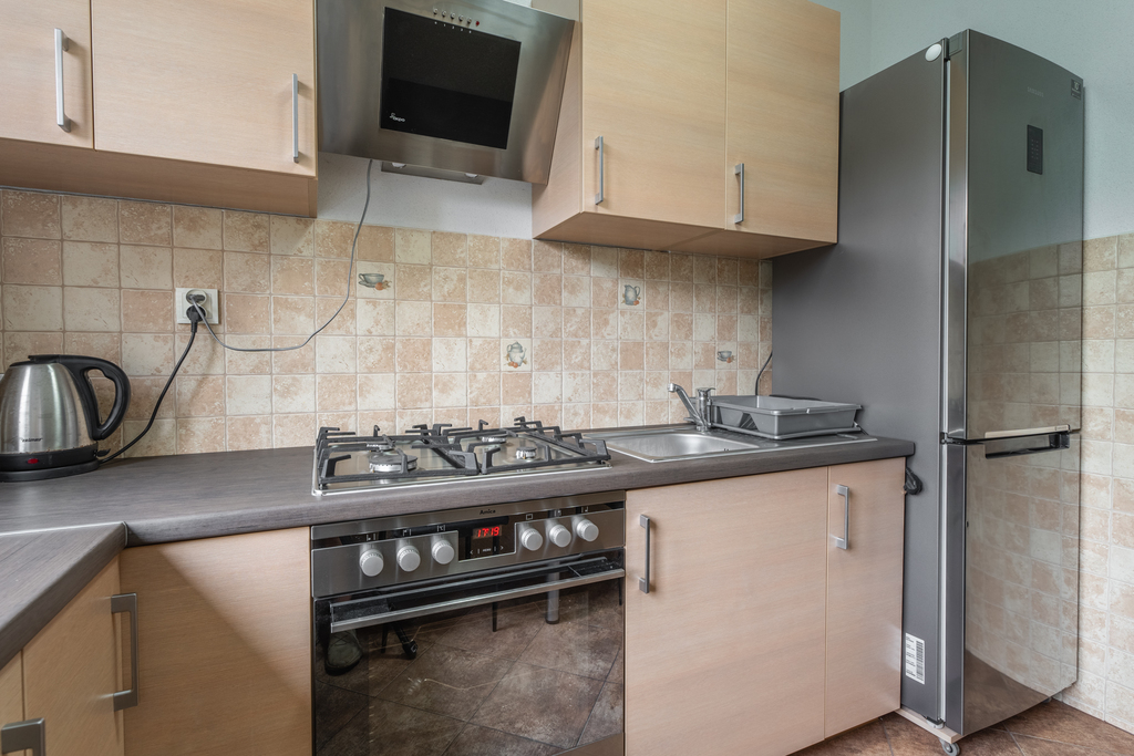 Salon (21,5 m2) wyposażony jest w meblościankę, kanapę rozkładaną, stolik, TV. Istnieje możliwość wymiany mebli w salonie lub doposażenia we własnym zakresie. W sypialni (9 m2): łóżko dwuosobowe z materacem, duża komoda. Kuchnia (6,5 m2) wyposażona we wszelkie niezbędne sprzęty: kuchenka gazowa, piekarnik, okap, lodówko-zamrażarka, zlewozmywak, stół z miejscami do siedzenia, meble w zabudowie z dużą ilością miejsca do przechowywania rzeczy. W łazience (4 m2): kabina prysznicowa, pralka, umywalka z szafką, podgrzewane lustro z podświetleniem. Osobna toaleta (1 m2) z szafą wiszącą w zabudowie do przechowywania rzeczy. W przedpokoju (7,5 m2) znajduje duża garderoba w zabudowie, szafka, wieszak. Drzwi antywłamaniowe. Okna PCV.