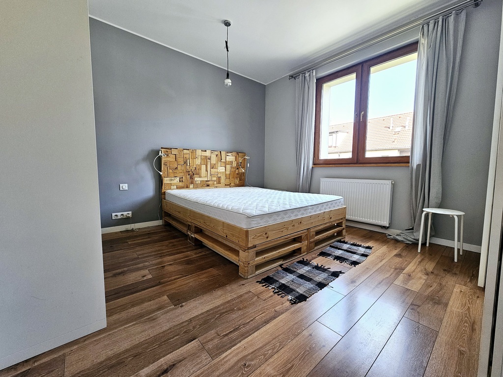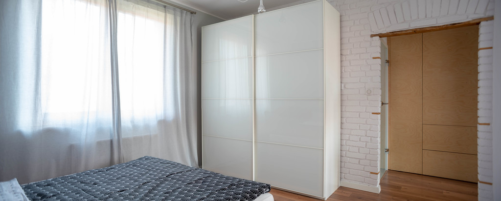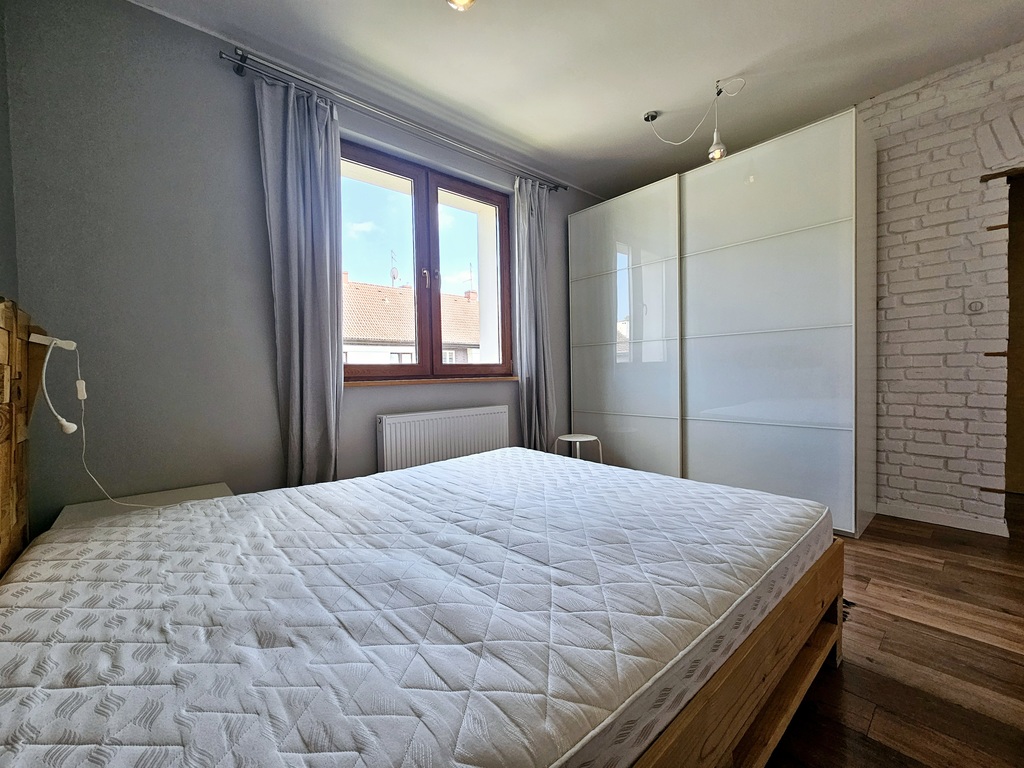 - sypialnia z dużym łóżkiem i szafą, co daje dodatkową przestrzeń na przechowywanie niezbędnych rzeczy.