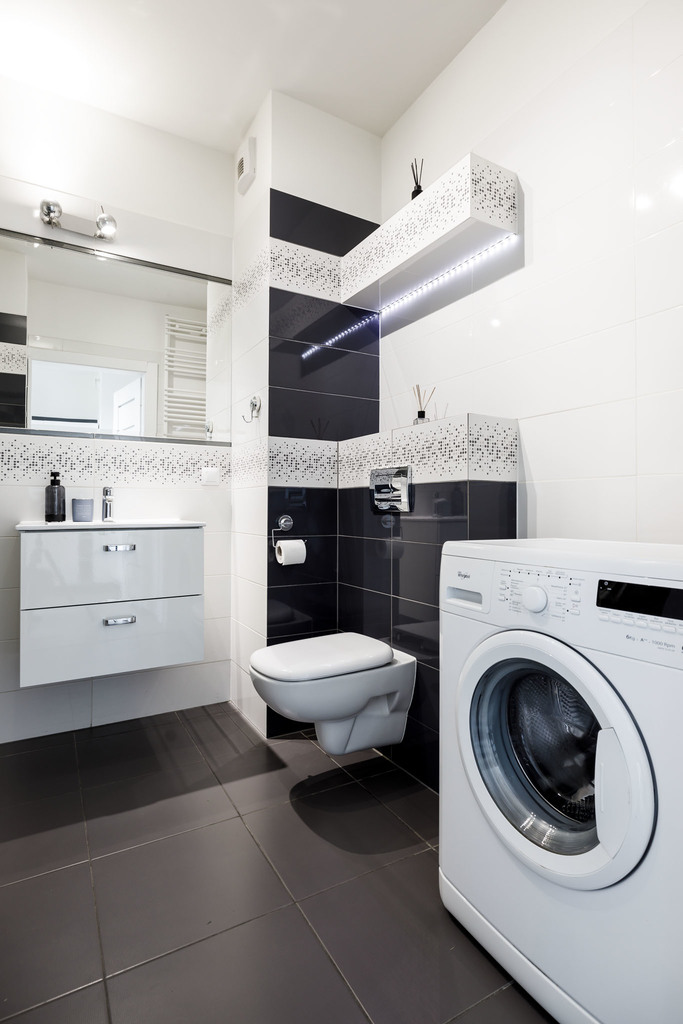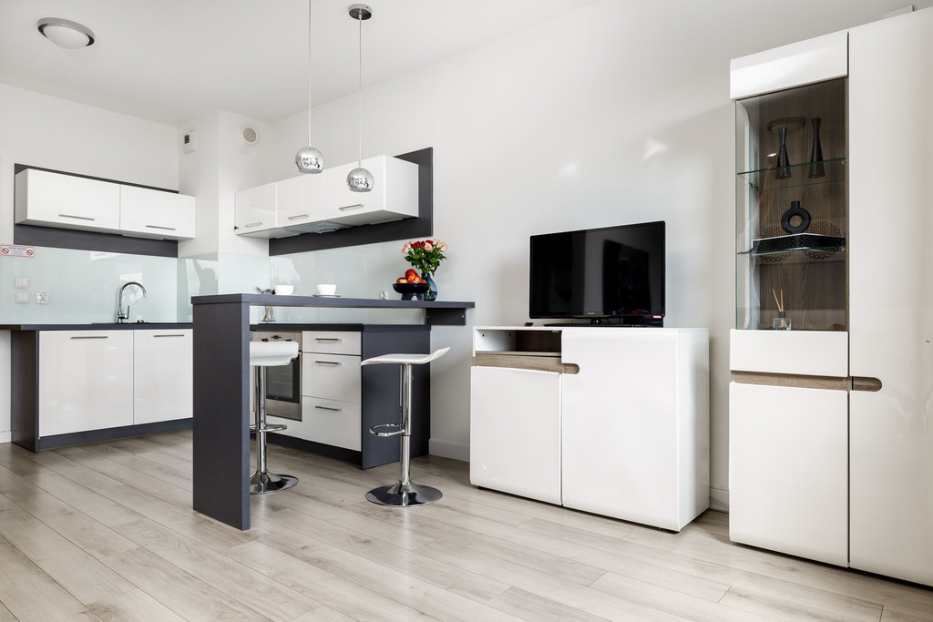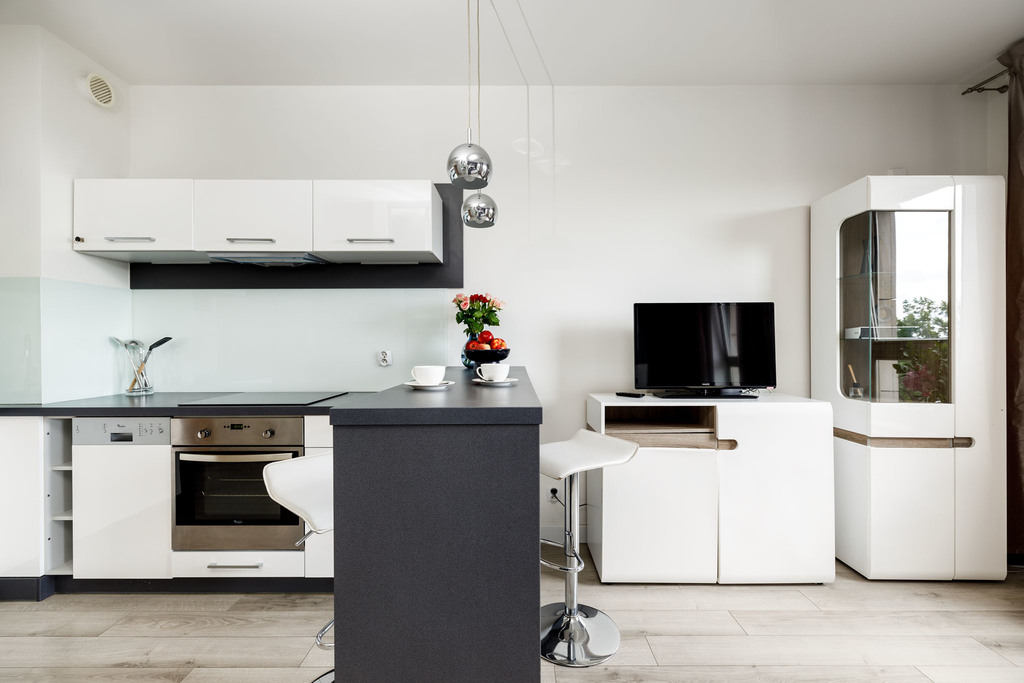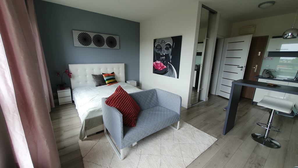 Mieszkanie umeblowane w nowoczesnym stylu , w aneksie kuchennym meble w zabudowie i sprzęt AGD ( zmywarka, lodówka, płyta elektryczna , piekarnik).