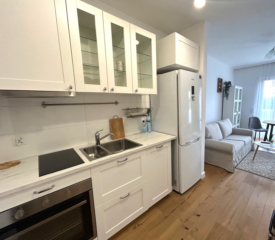 - aneks kuchenny (meble w zabudowie, lodówka z zamrażarką, płyta grzewcza, pochłaniacz, zmywarka)