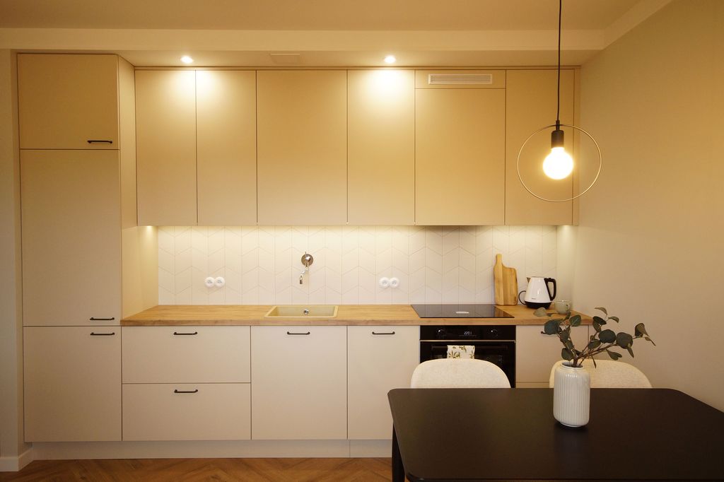 Meble kuchenne, łazienkowe i szafa w przedpokoju wykonane przez stolarza na wymiar.