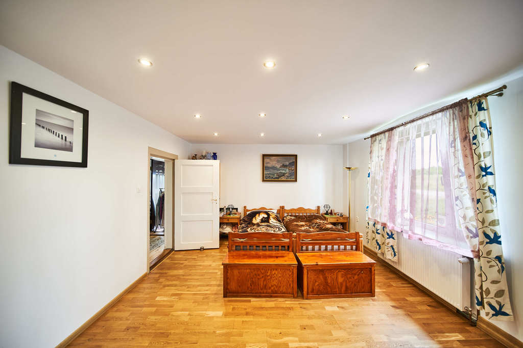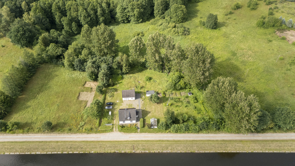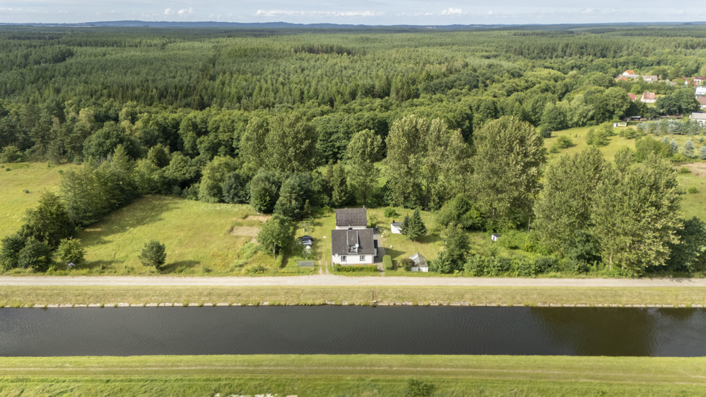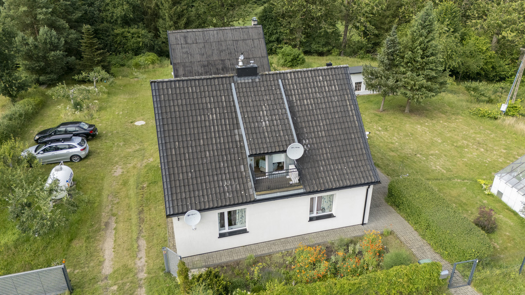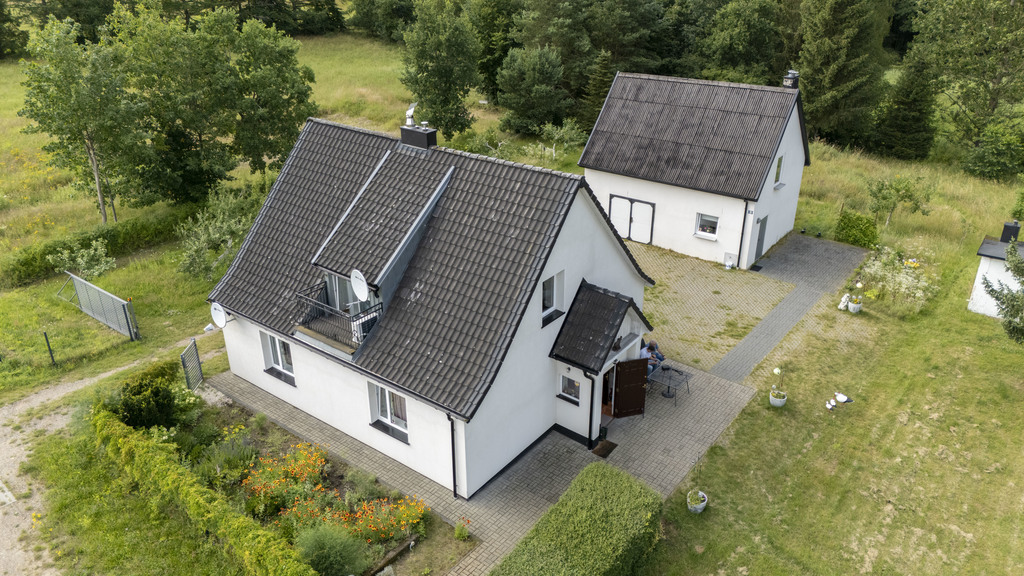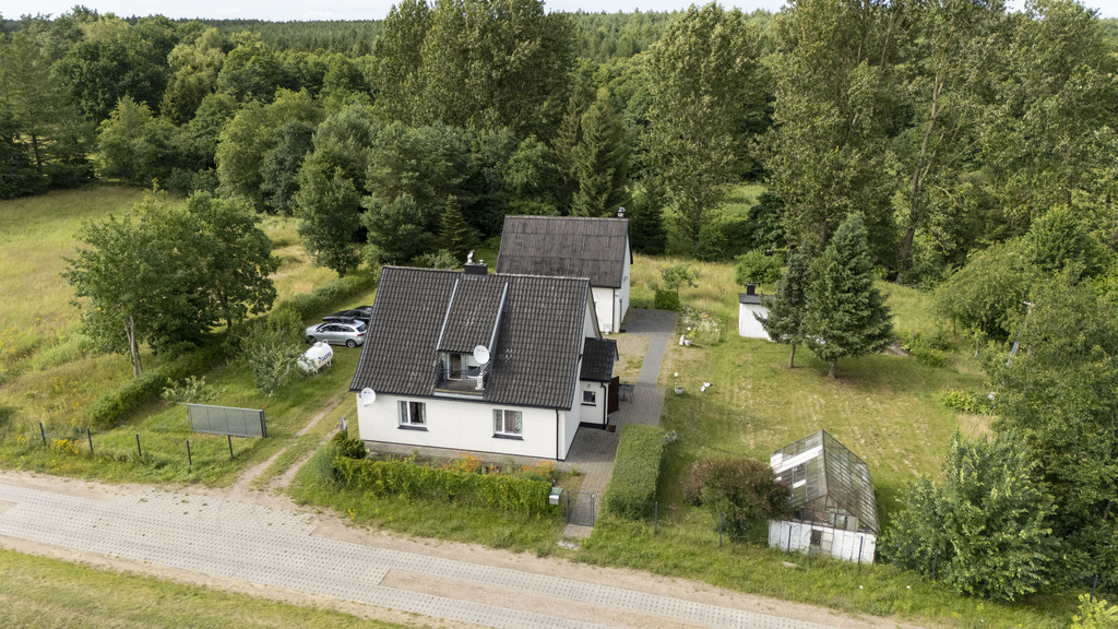 Całość znajduje się na dwóch sąsiadujących działkach, Pierwsza zabudowana jest budynkiem mieszkalnym jednorodzinnym wybudowanym przed 1939r, parterowym z użytkowym poddaszem o łącznej pow. użytkowej 110,51 m2 oraz częściowym podpiwniczeniem o pow. 12,44 m2. Na parterze wydzielono 2 pokoje, salon, łazienkę, kuchnię, przedpokój, ganek o pow. 72,49m2, na poddaszu wydzielono salon z kominkiem, sypialnia, wc, umywalka, 2 strychy, obiekt po remoncie generalnym z 2020r Ponadto na działce znajduje się budynek gospodarczy parterowy z gospodarczym poddaszem, budynek o pow. użytkowej 65,60 m2 w tym parter 41,47m2, poddasze 24,13 m2. Działka uzbrojona w sieć energetyczną, wodociągową, brak zdalnej sieci gazowej, kanalizacyjnej, odprowadzenie ścieków z budynku mieszkalnego do oczyszczalni przydomowej, ogrzewanie gazowe, zasilane z butli zamontowanej na zewnątrz. Teren nie objęty planem miejscowym, w poprzednim planie opisany jako teren usług turystycznych, mieszkalnictwa jednorodzinnego.