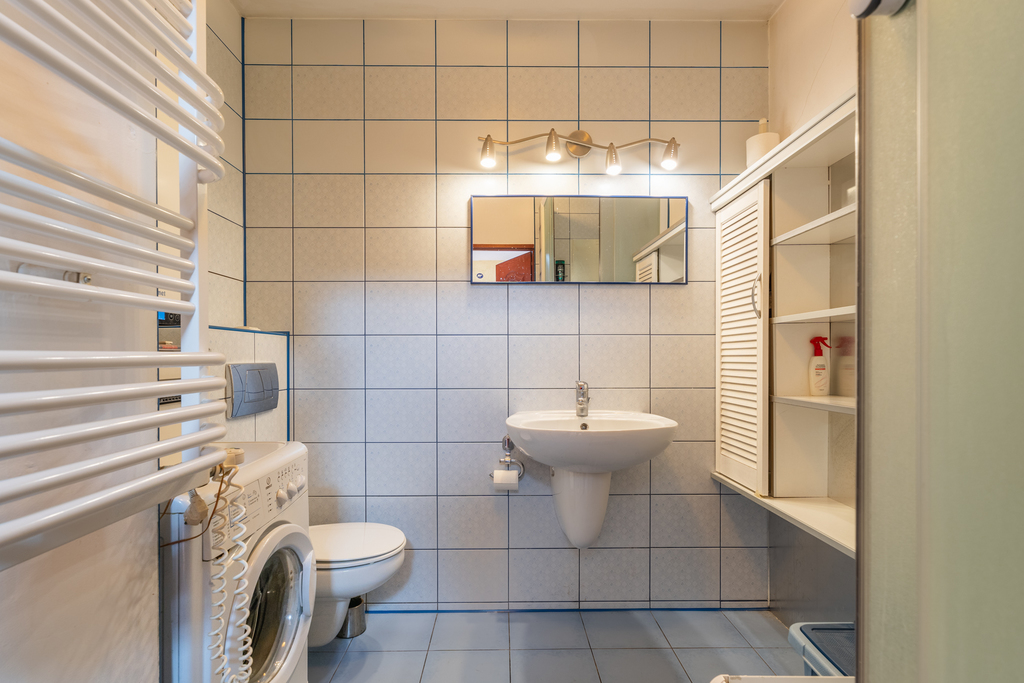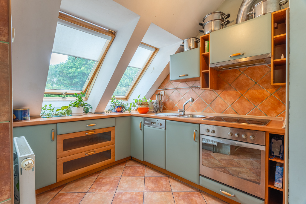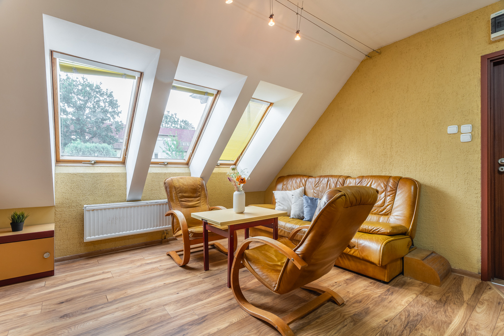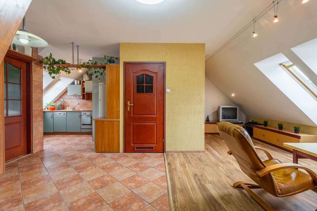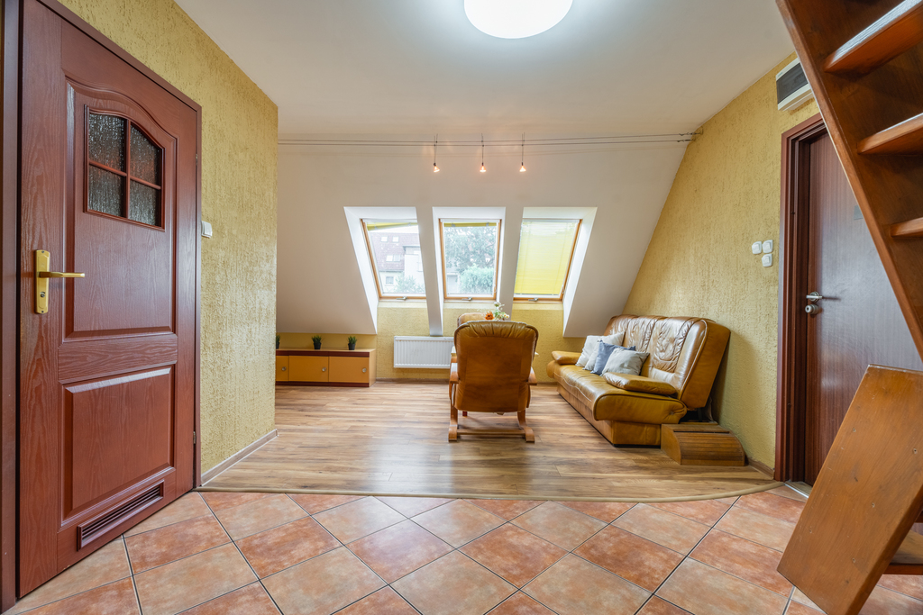 Mieszkanie bardzo widne i słoneczne, znajduje się na 2 piętrze i jest dwupoziomowe (tylko 2 mieszkania na piętrze). Oficjalna powierzchnia użytkowa lokalu wynosi 45.80 m2, jednak w rzeczywistości mieszkanie sprawia wrażenie dużo większego. Faktyczny metraż jest znacznie powiększony o ustawną przestrzeń pod skosami.