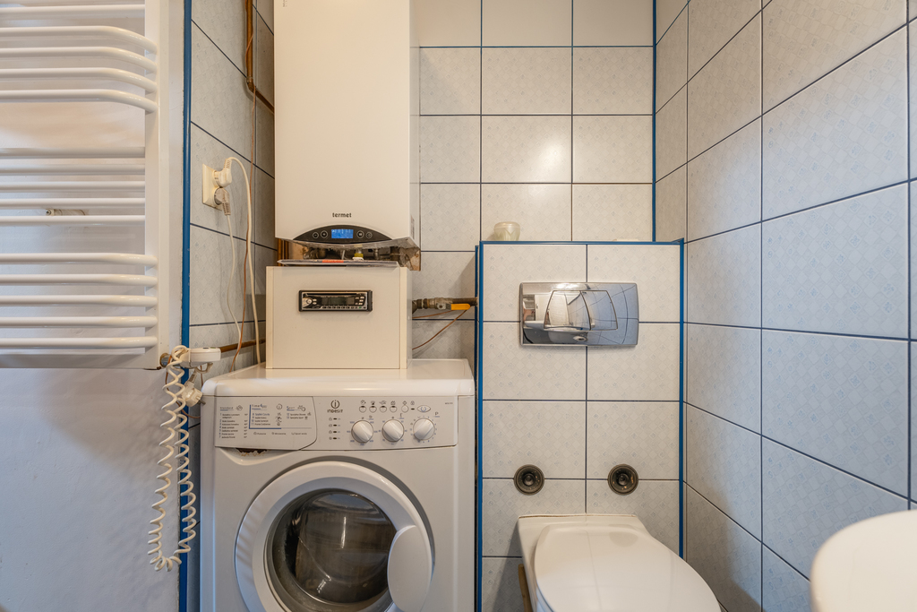 Ogrzewanie i ciepła woda są gazowe, a system opiera się na kotle dwufunkcyjnym, który zapewnia wygodę w codziennym użytkowaniu.