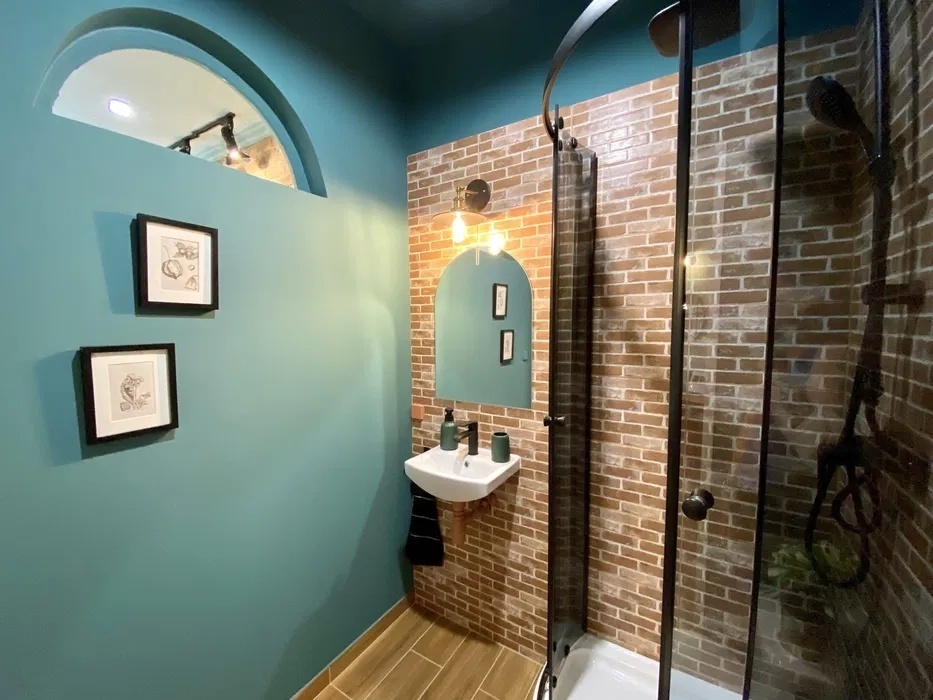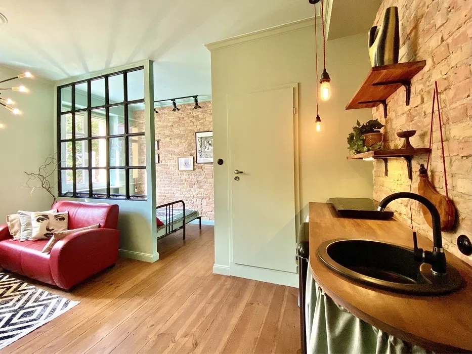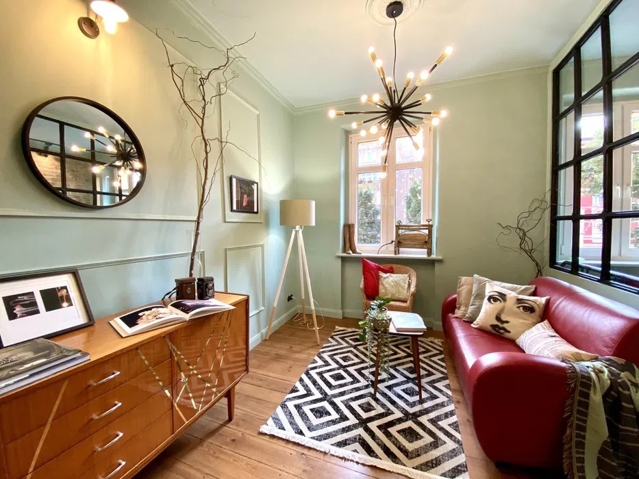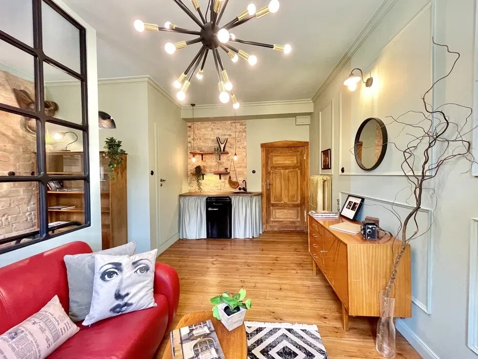 Apartament z aneksem kuchennym i łazienką, sypialnią, kuchenką indukcyjną, pralką, nową lodówką retro pod kolor oraz nietuzinkowym, przemyślanym wyposażeniem.