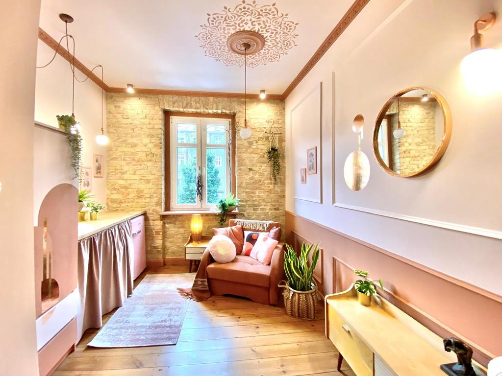 Wyjatkowy apartament Boho Haven w centrum miasta w eklektycznym stylu z elementami boho, glamour, modern mid century i Art Deco.
