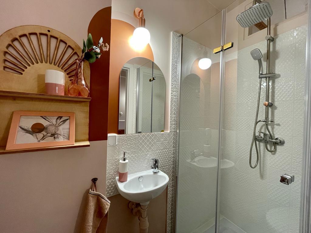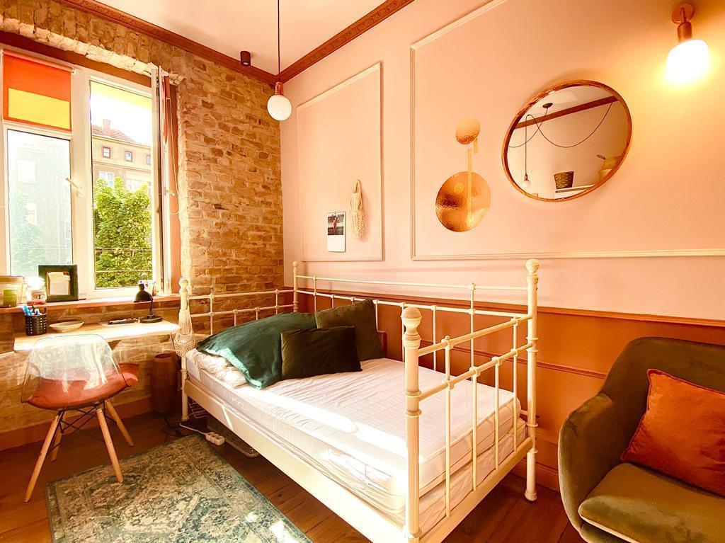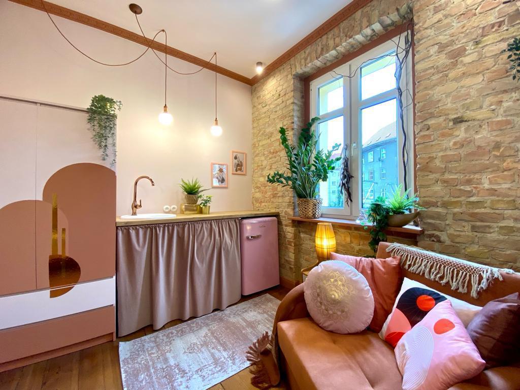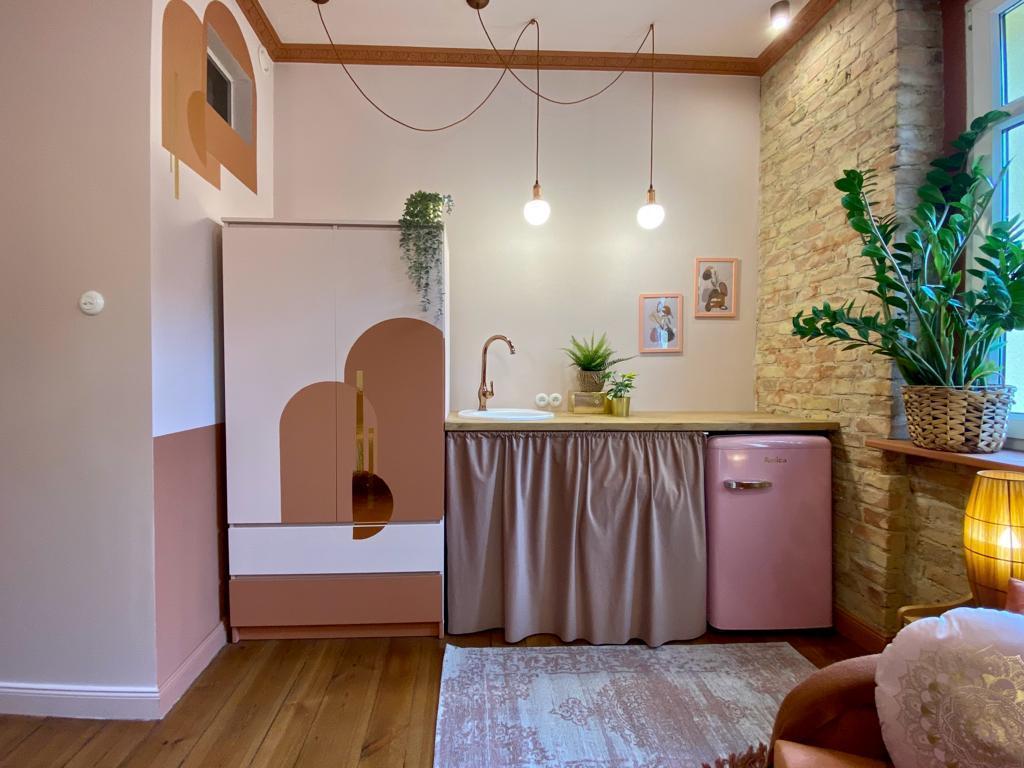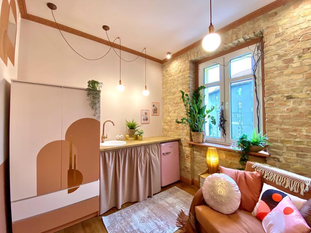 Apartament z aneksem kuchennym, kuchenką indukcyjną, pralką, nową lodówką retro pod kolor, łazienką oraz nietuzinkowym, przemyślanym wyposażeniem.