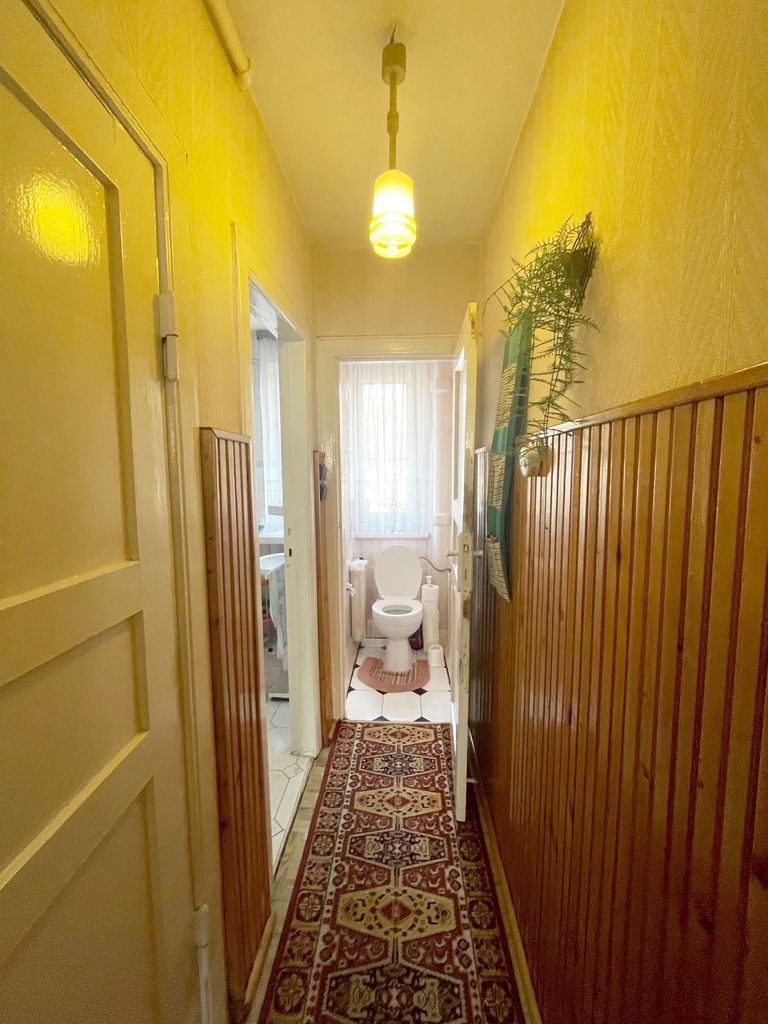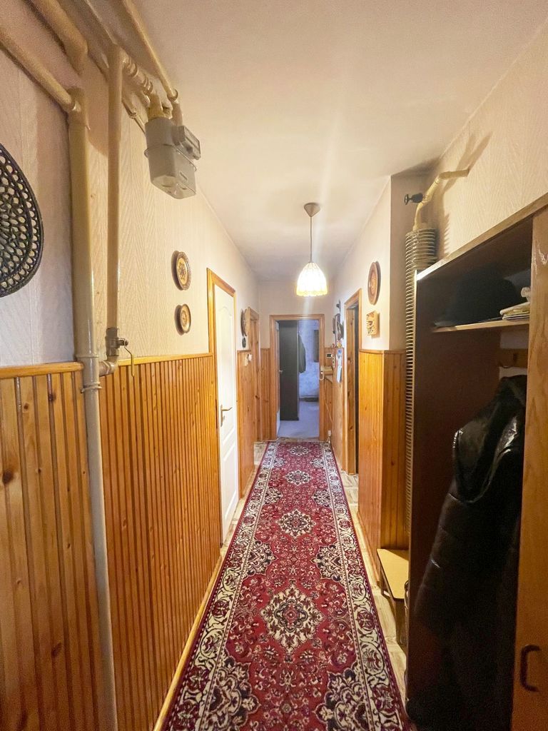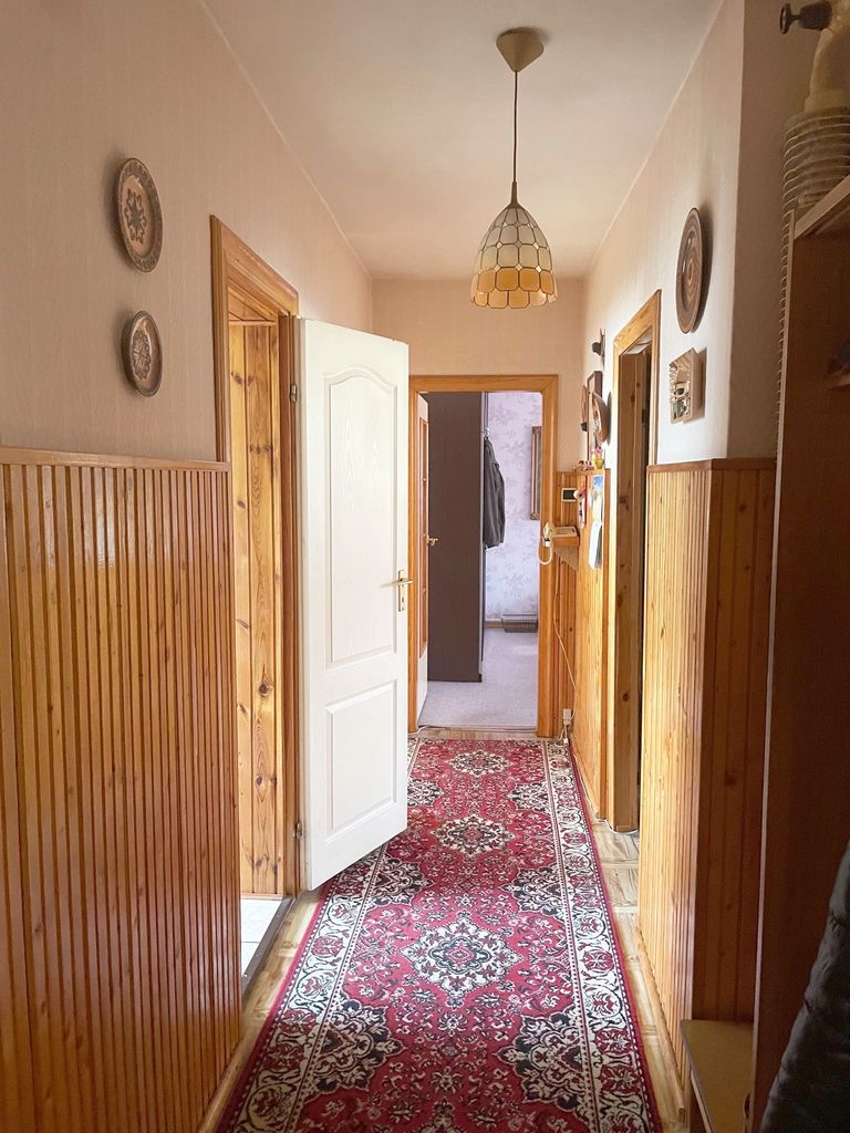 W przedpokoju na ścianach częściowo położona boazeria na podłodze linoleum.