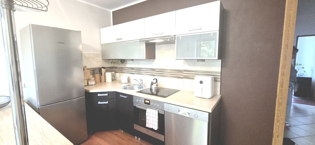 Kuchnia wyposażona w meble kuchenne wraz ze sprzętem AGD.