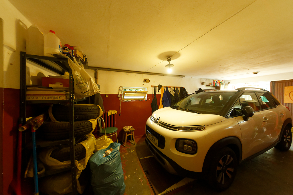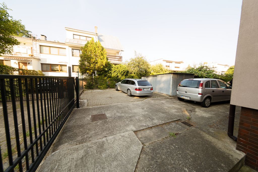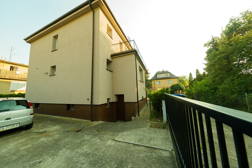 Dom posiada garaż oraz wybrukowane dwa miejsca postojowe na tyłach domu z osobną bramą wjazdową.
