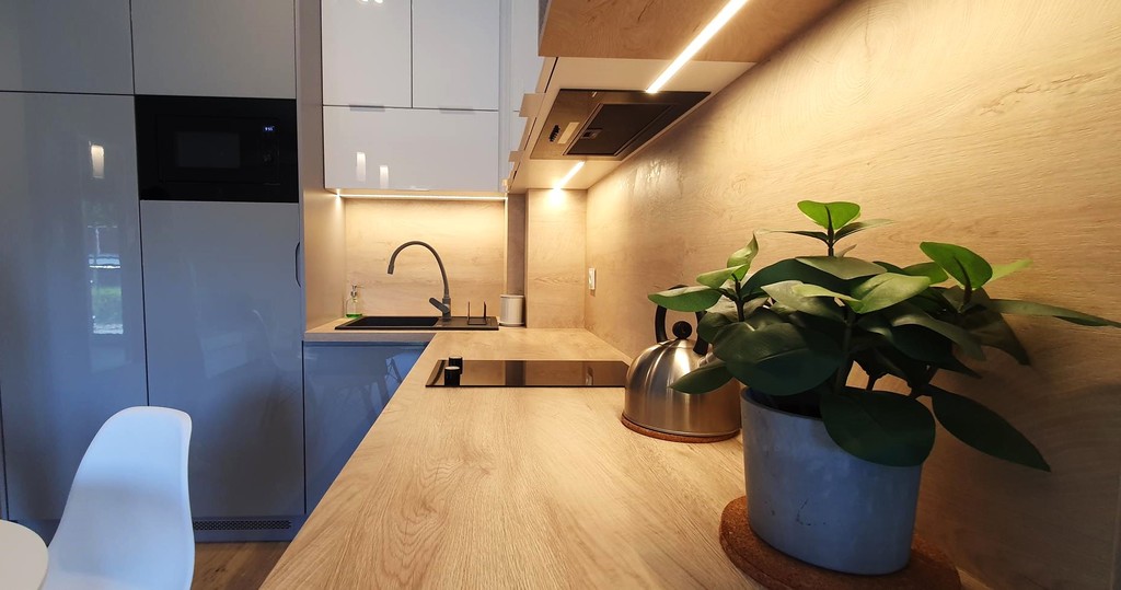 - kuchnia - meble w zabudowie wraz z niezbędnym sprzętem AGD,