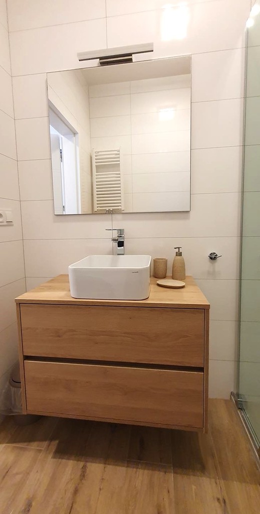- łazienka - kabina prysznicowa, kompakt WC w zabudowie, szafka z umywalką, pralka,