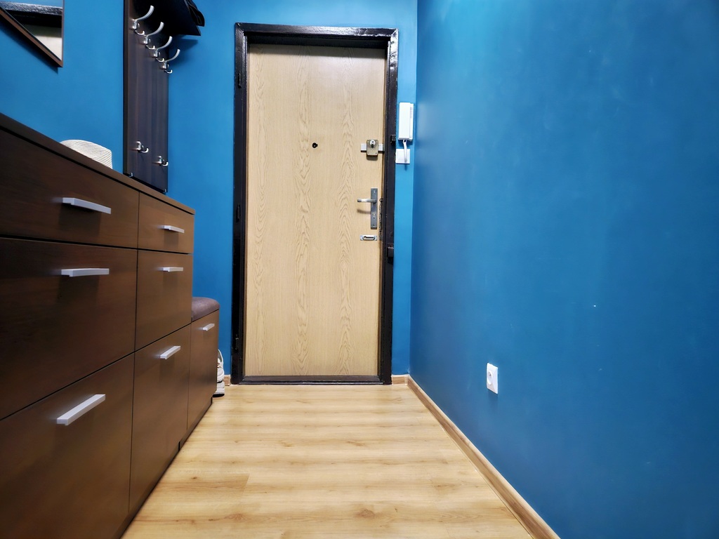 - przedpokoju - w którym znajduje się duża szafa z lustrem, która pozwala na przechowywanie ubrań, butów i innych niezbędnych akcesoriów.