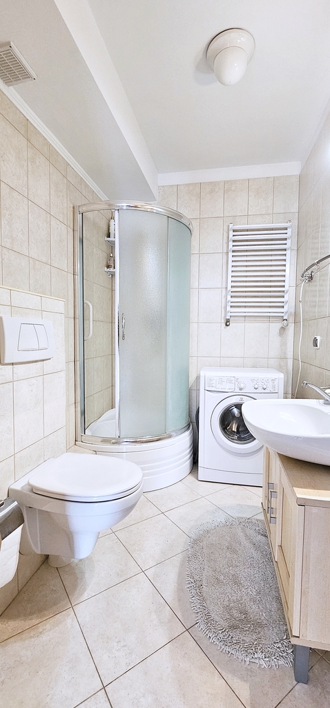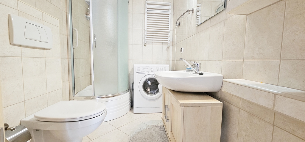 Przestronnego salonu z nowocześnie wyposażoną kuchnia, sypialni, łazienki z prysznicem, dużego balkonu.. Ogrzewanie i gorąca woda pochodzą z lokalnej sieci i są rozliczane w czynszu. W kuchni oraz łazience dodatkowo niezależne ogrzewanie podłogowe. Sprzedawany jest z kompletnym umeblowaniem i wyposażeniem.