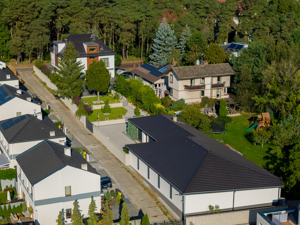 Dom wyposażony w klimatyzacje z funkcją grzania i chłodzenia, ogrzewanie podłogowe piec gazowy dwuobiegowy. Stolarka okienna wykonana z drewna mahoniowego z szybami antywłamaniowymi oraz roletami zewnętrznymi z funkcją programowania czasowego. Dom wyposażony w instalacje alarmową, przeciwpożarową, internetową, telefoniczną, wideofon, centralny odkurzacz. Podłogi wyłożone płytami Marmur-Gres, w sypialniach deska egzotyczna. W salonie system kina domowego. ]