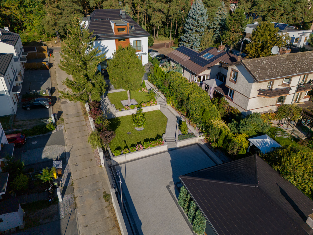 Piękny ogród z nawadnianiem, liczne nasadzenia, dwie bramy wjazdowe automatycznie otwierane, dwa oświetlone parkingi wyłożone kostką granitową.