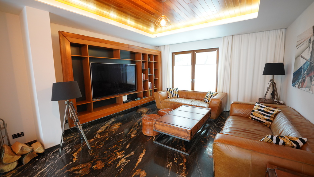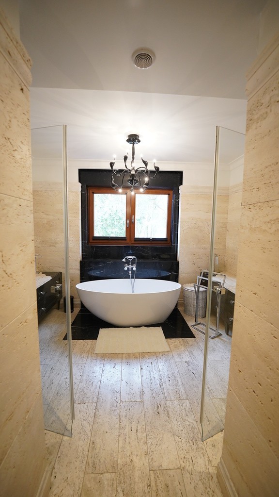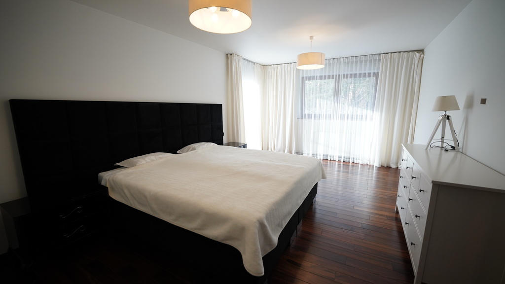 Sypialnia (24,83m2), pokój (21,97m2) z garderoba i łazienką (6,88m2), łazienka z wanną i dwoma prysznicami, hiszpańska glazura i terakota (13,69m2)