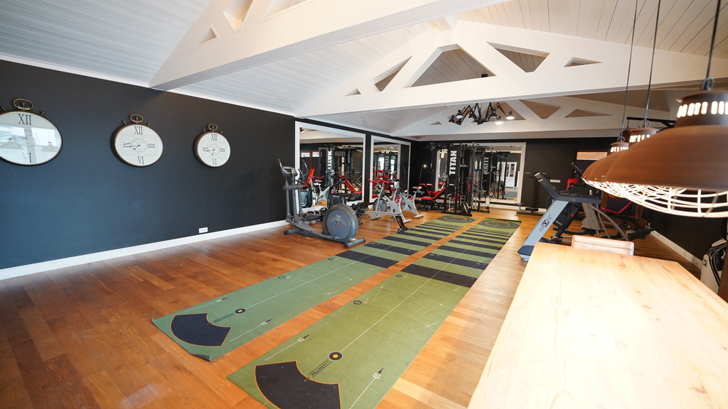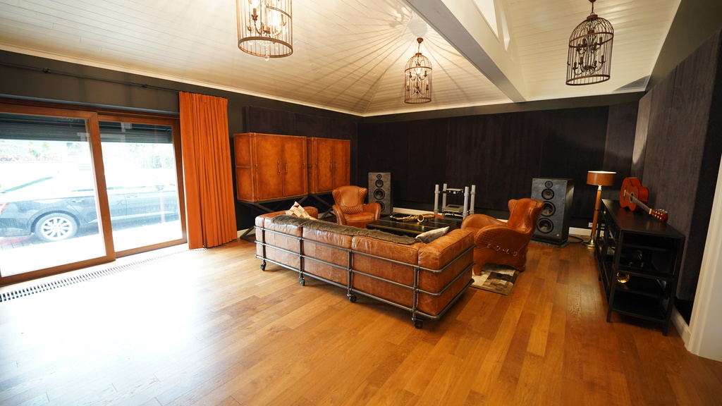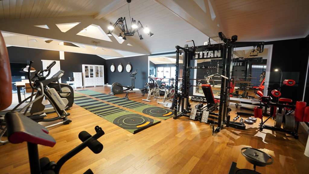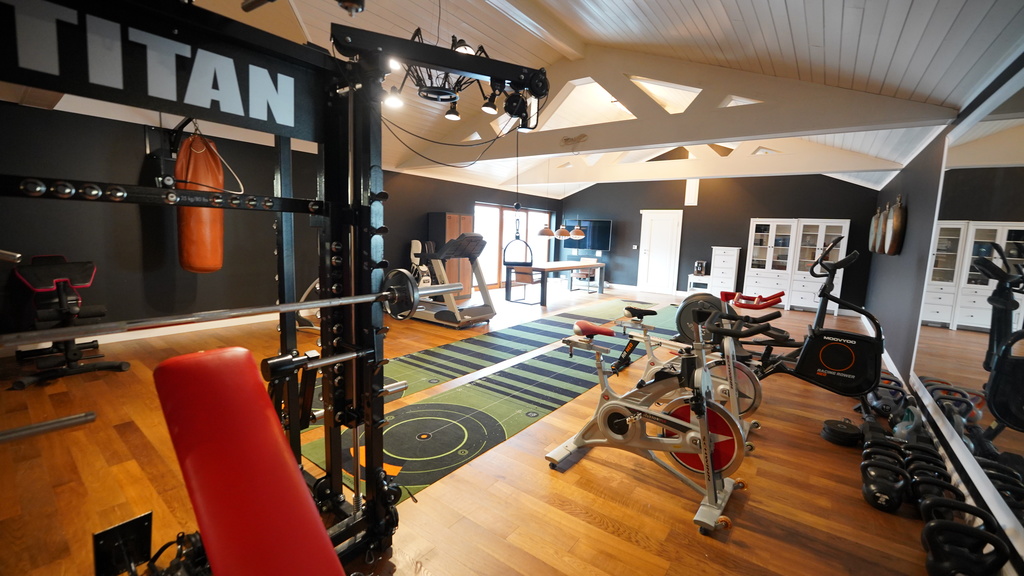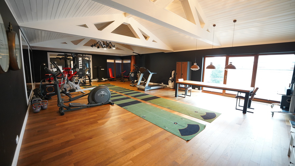 Budynek 385m2 z garażem 283m2 z miejscem do 8 samochodów oraz częścią na rowery, siłownią (47m2), pokojem muzycznym z wysokiej jakości nagłośnieniem i wygłuszeniem (43,31m2), łazienka (5,45m2), hall (7,10m2).