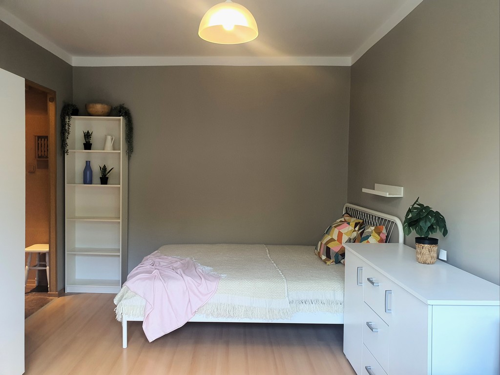 -pokoju o powierzchni 18m wyposażonego w łóżko małżeńskie, sofę, pojemną szafę, komodę, stolik i krzesła a także regał na książki itp.