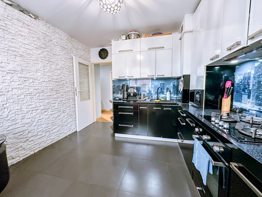Kuchnia w biało-czarnej zabudowie.