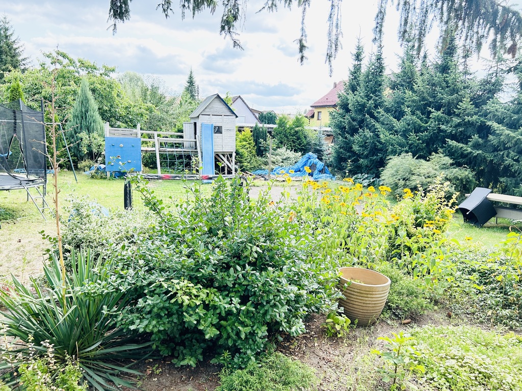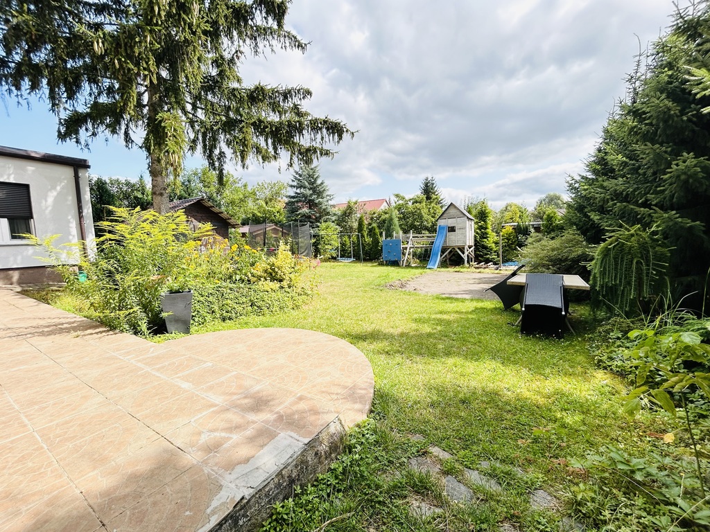 Duży ogród na którym znajduje się plac zabaw dla dzieci.