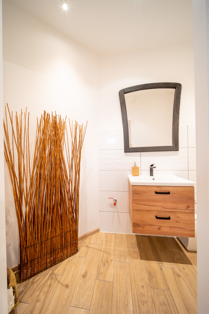 Na podłodze gres imitujący drewno, całość utrzymana w jasnej szarości i beżu, schody granitowe, .
