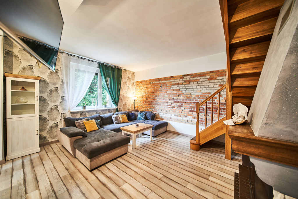Na pierwszym poziomie znajduje się przestronny salon połączony z otwartą kuchnią, co tworzy przyjazną przestrzeń do wypoczynku i spotkań rodzinnych. Dodatkowo na tym poziomie mieści się także łazienka oraz sypialnia, co zapewnia wygodę i komfort użytkowania.