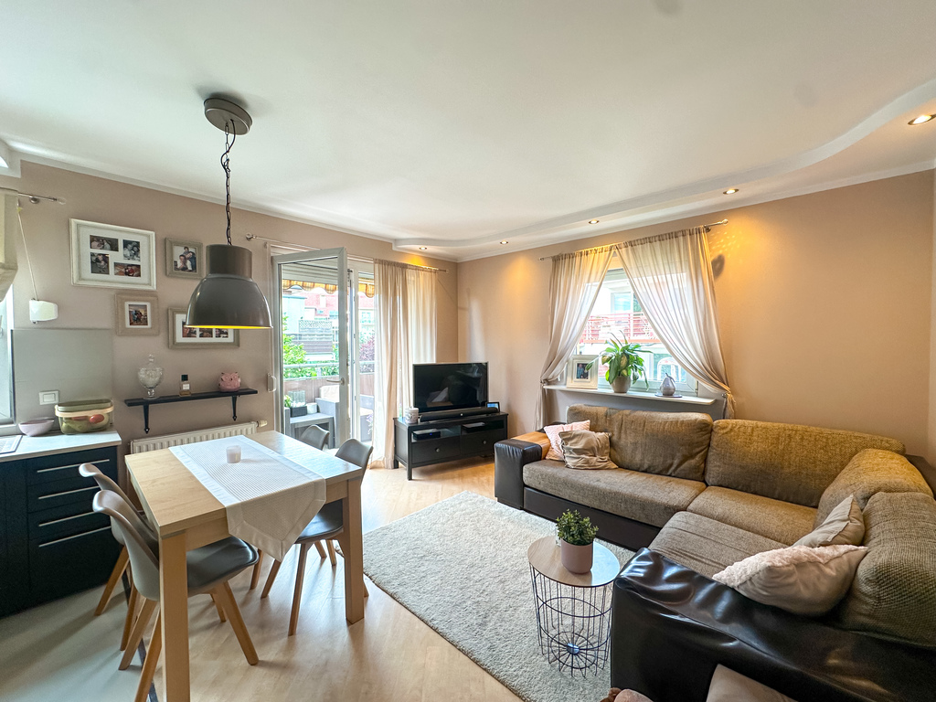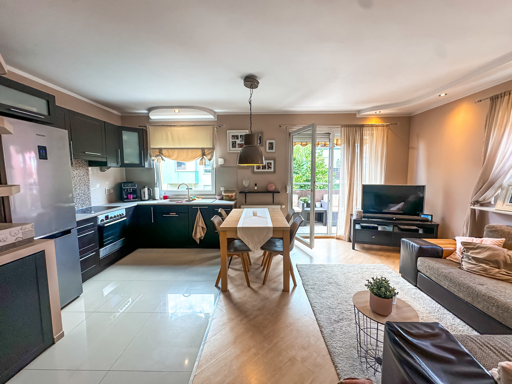 Mieszkanie składa się z trzech przestronnych i jasnych pokoi, w tym salonu połączonego z aneksem kuchennym. Z salonu można wyjść na bardzo duży narożny balkon, wyposażony w markizę, co pozwala na korzystanie z niego nawet w gorące dni. Pomimo pozornie niewielkiego metrażu, mieszkanie ma przemyślany układ, który sprawia, że każdy pokój jest przestronny i funkcjonalny, dzięki czemu idealnie sprawdzi się dla rodziny z dzieckiem.