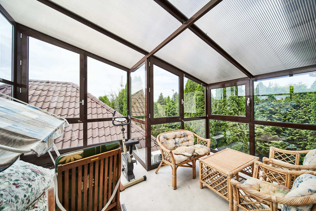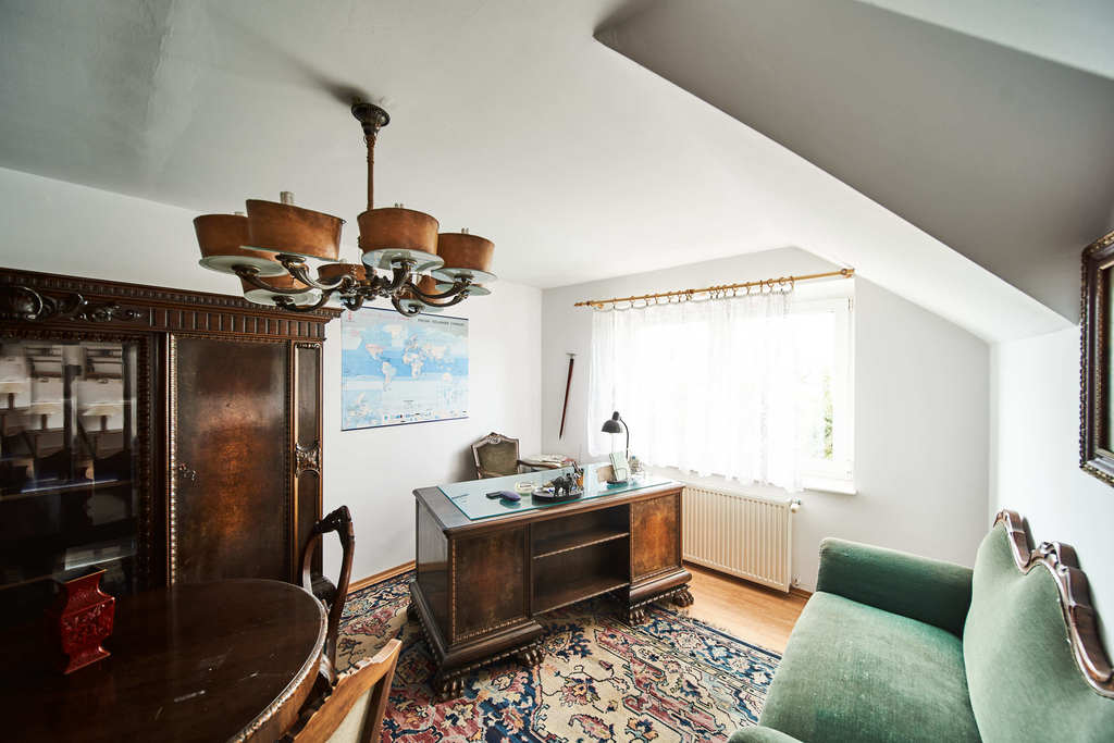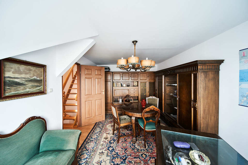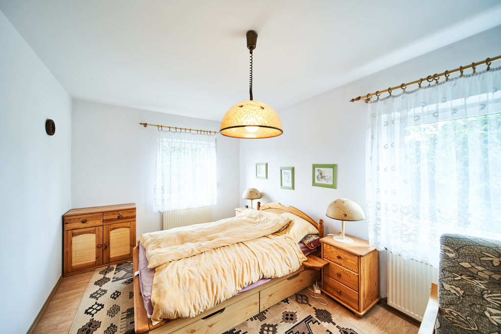 Na I piętro prowadzą schody wylewane, obłożone drewnem. Znajduje się tam łazienka i 2 sypialnie, jedna z wyjściem na ogród zimowy.