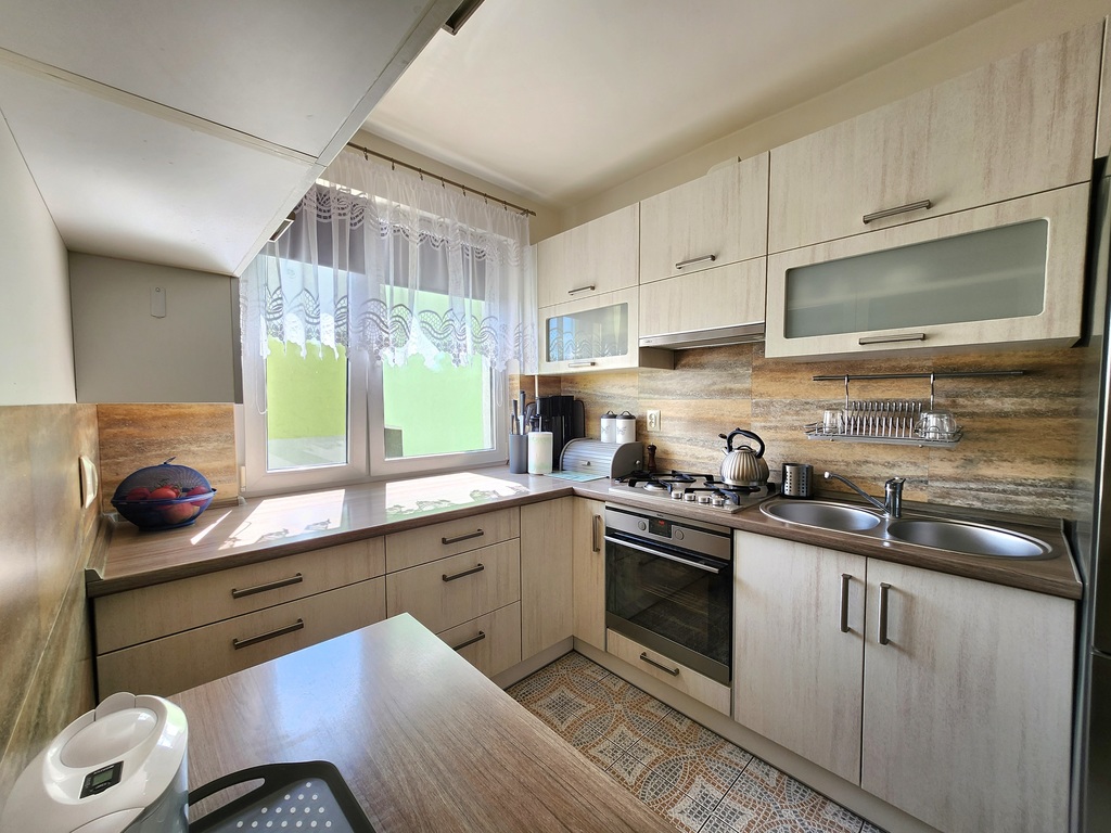 Kuchnia funkcjonalnie zaaranżowana z meblami w zabudowie. W korytarzu pojemna szafa typu komandor.