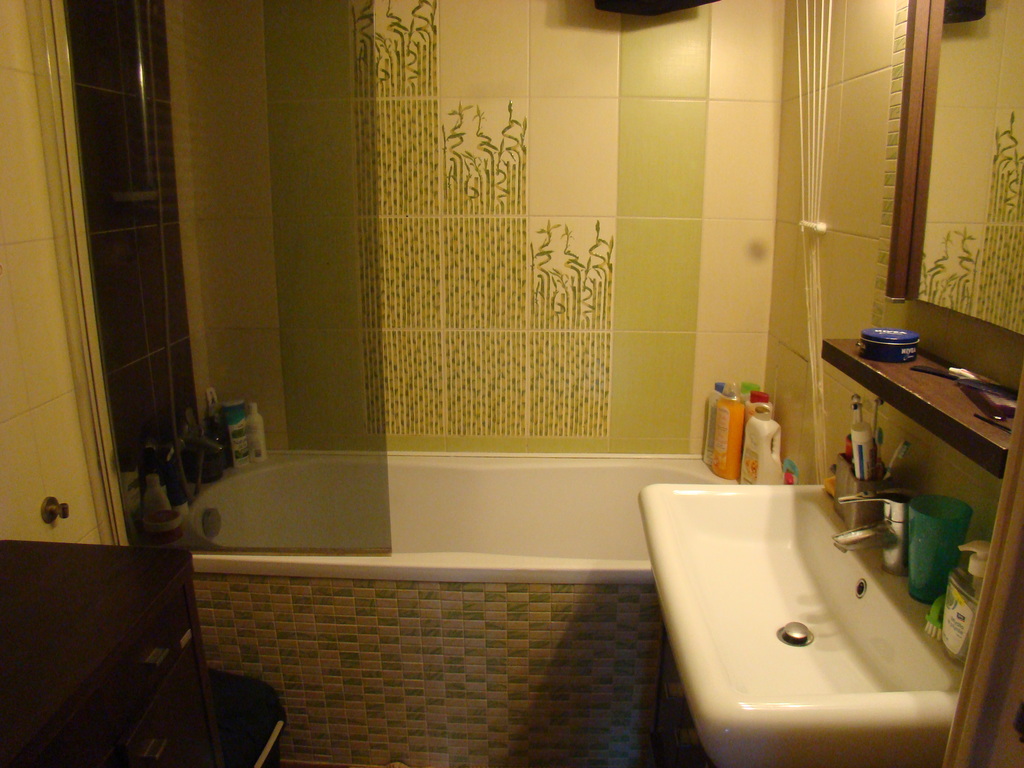 Łazienka w glazurze i terakocie z wanną z opcją prysznica oraz umywalką.