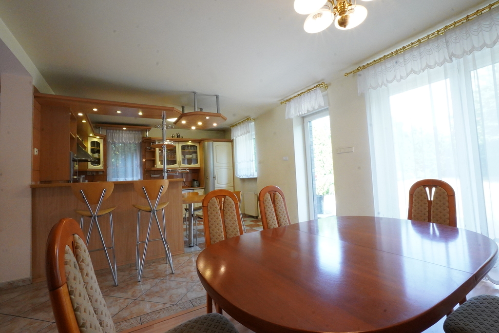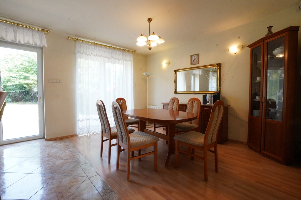 - część dzienną ( parter) z wiatrołapem, korytarzem z klatką schodową prowadzącą na piętro, oraz z pokojem dziennym ( salon) , kuchnią z jadalnią i łazienką. Z salonu prowadzą drzwi na taras frontowy (balkon). Część jadalniana posiada 2 wyjścia na taras ogrodowy- jedno bezpośrednie , drugie przez ogród zimowy,