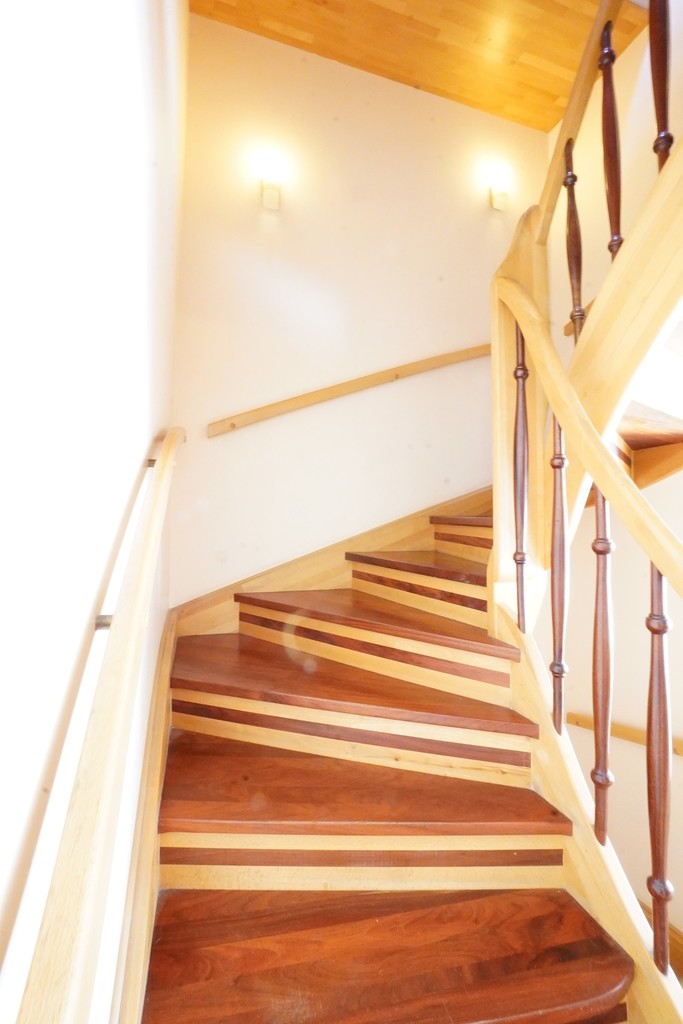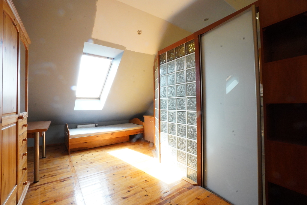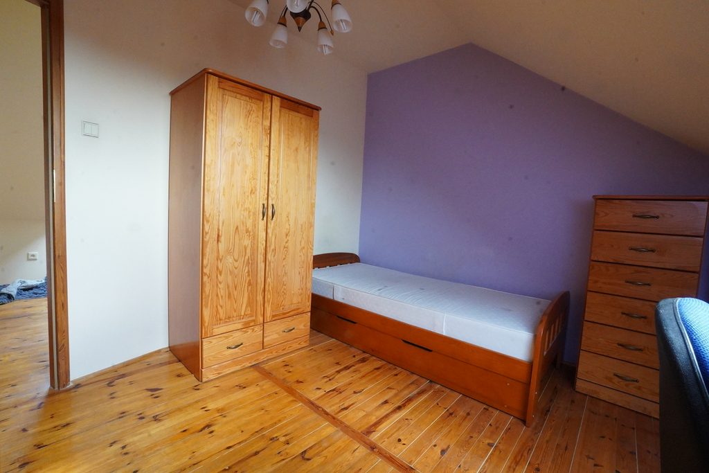 - antresolę,  gdzie znajdują się 2 sypialnie , w tym jedna z łazienką. Na antresolę prowadzi klatka schodowa,