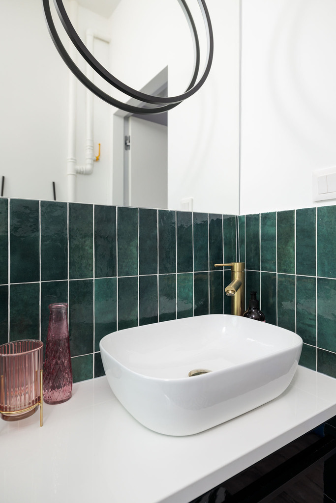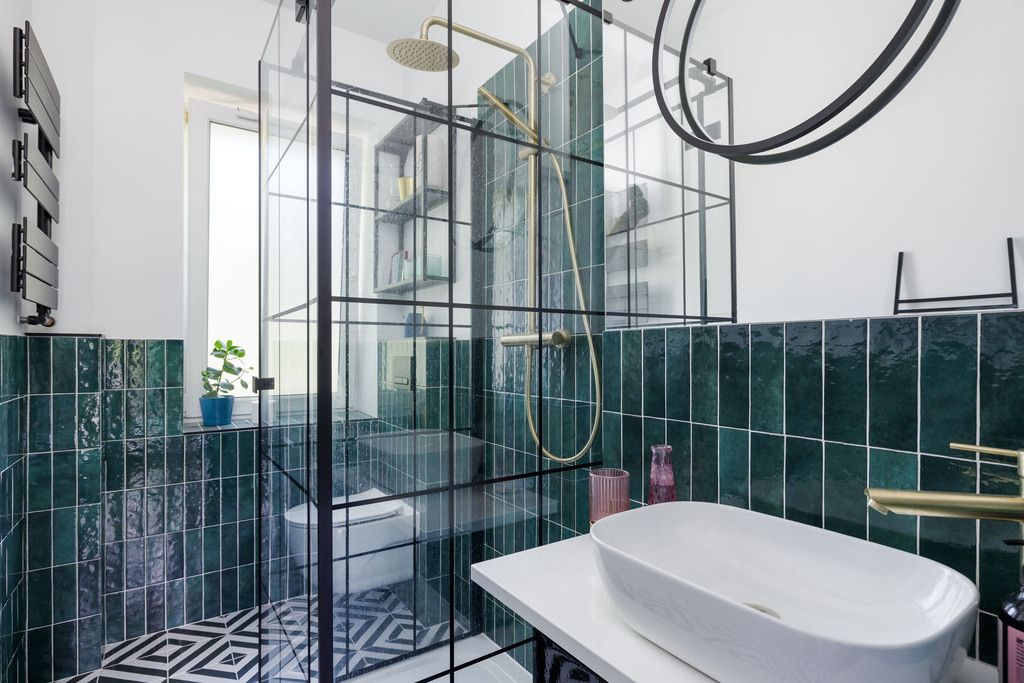 Łazienka: z oknem, z kabiną prysznicową, remontowana w 2023r., estetyczna, w kaflach koloru butelkowej zieleni.