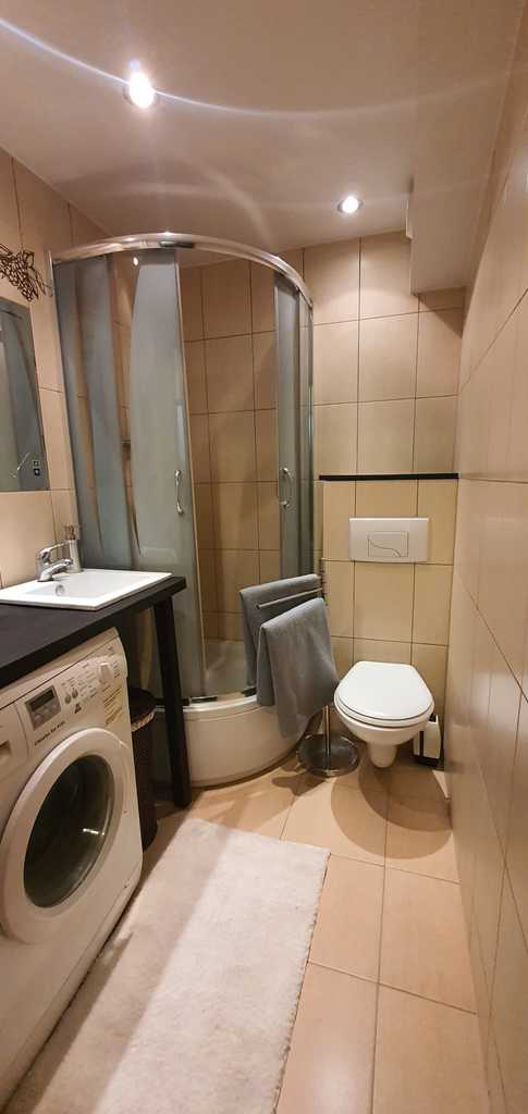 Łazienka w nowoczesnej glazurze i terakocie, z kabina prysznicową i WC, z pralką.