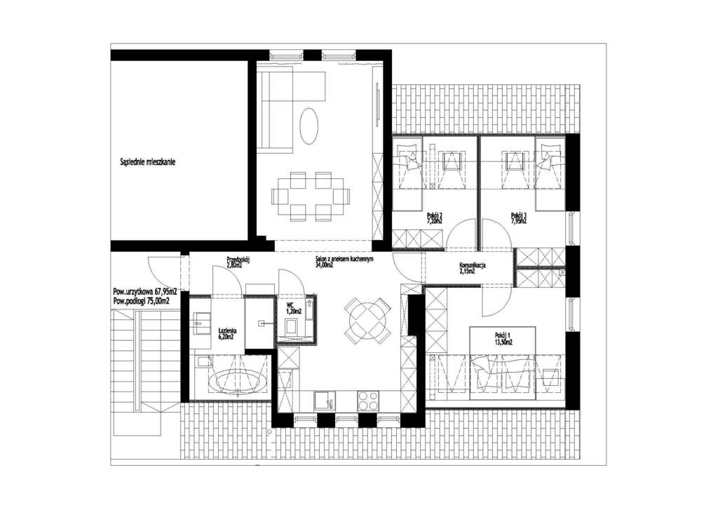 Na powierzchnię 67,95 m2 składają się trzy pokoje, korytarz, kuchnia z oknem oraz łazienka z WC.