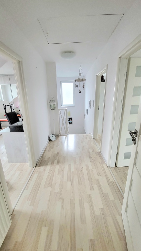 Na wyposażeniu mieszkania znajduje się m. in. zabudowa kuchenna, lodówka, kuchenka, pralka i zabudowy szaf, meble sypialniane, kanapy, szafki nocne, szafki wnękowe. Drzwi antywłamaniowe, energooszczędne okna PCV, ogrzewanie gazowe (piec dwu obiegowy). Na podłodze znajdują się panele, natomiast kuchnia, korytarz/schody i łazienka wykończone są płytkami, własność z KW. Ogrzewanie i ciepła woda pochodzą z pieca gazowego, w salonie znajduje się dodatkowo kominek. Media pochodzą z sieci miejskiej.