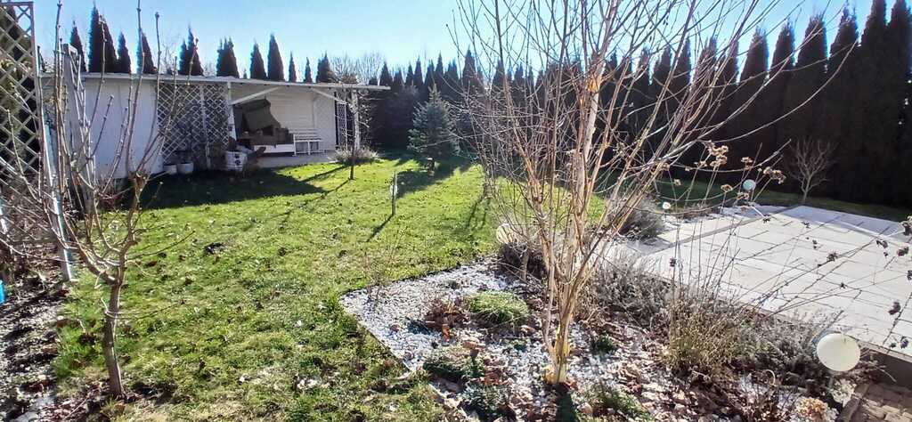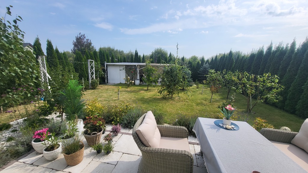 Pięknie zaadaptowany ogród z miejscem na przechowywanie narzędzi ogrodowych (2 domki/szopki ogrodowe), patio (3m x 5m) oraz taras (3,30 m x 5m).