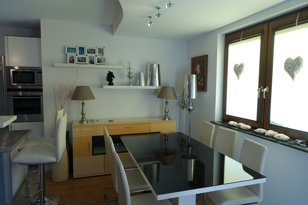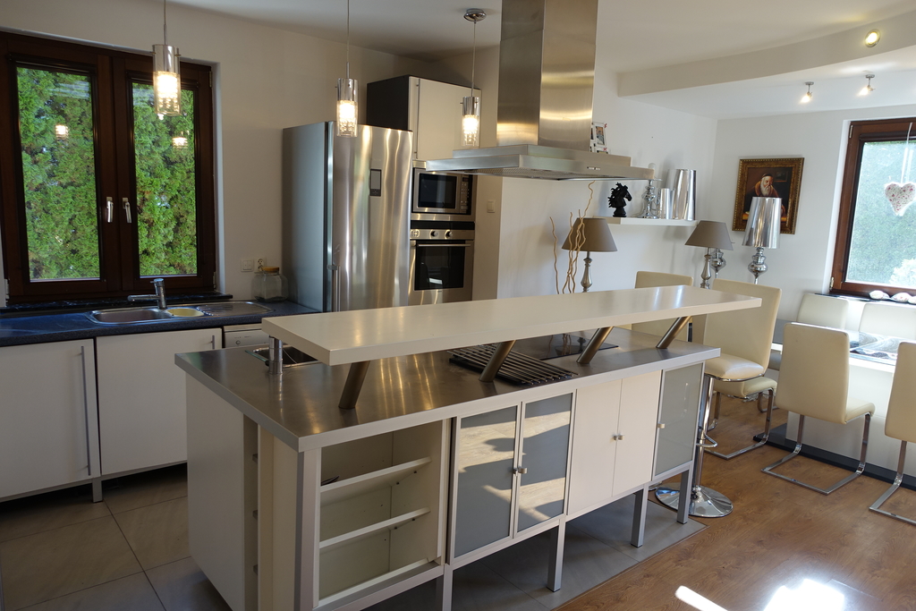 Z salonu wyjście na taras i do ogrodu. Na podłogach panele i terakota. Meble kuchenne w zabudowie wraz ze sprzętem AGD firmy Siemens oraz Bosch: lodówka z zamrażarką, zmywarka 60 cm, płyta ceramiczna, piekarnik.